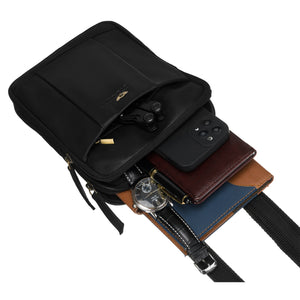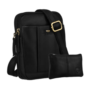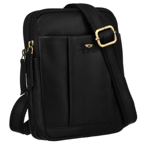 Peterson vīriešu rokassoma, izgatavota no mākslīgās ādas, melnā krāsā, ar diviem nodalījumiem un trim kabatām.