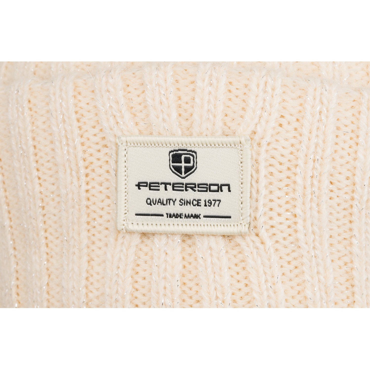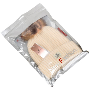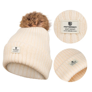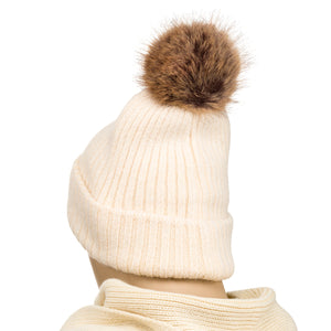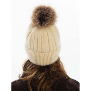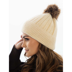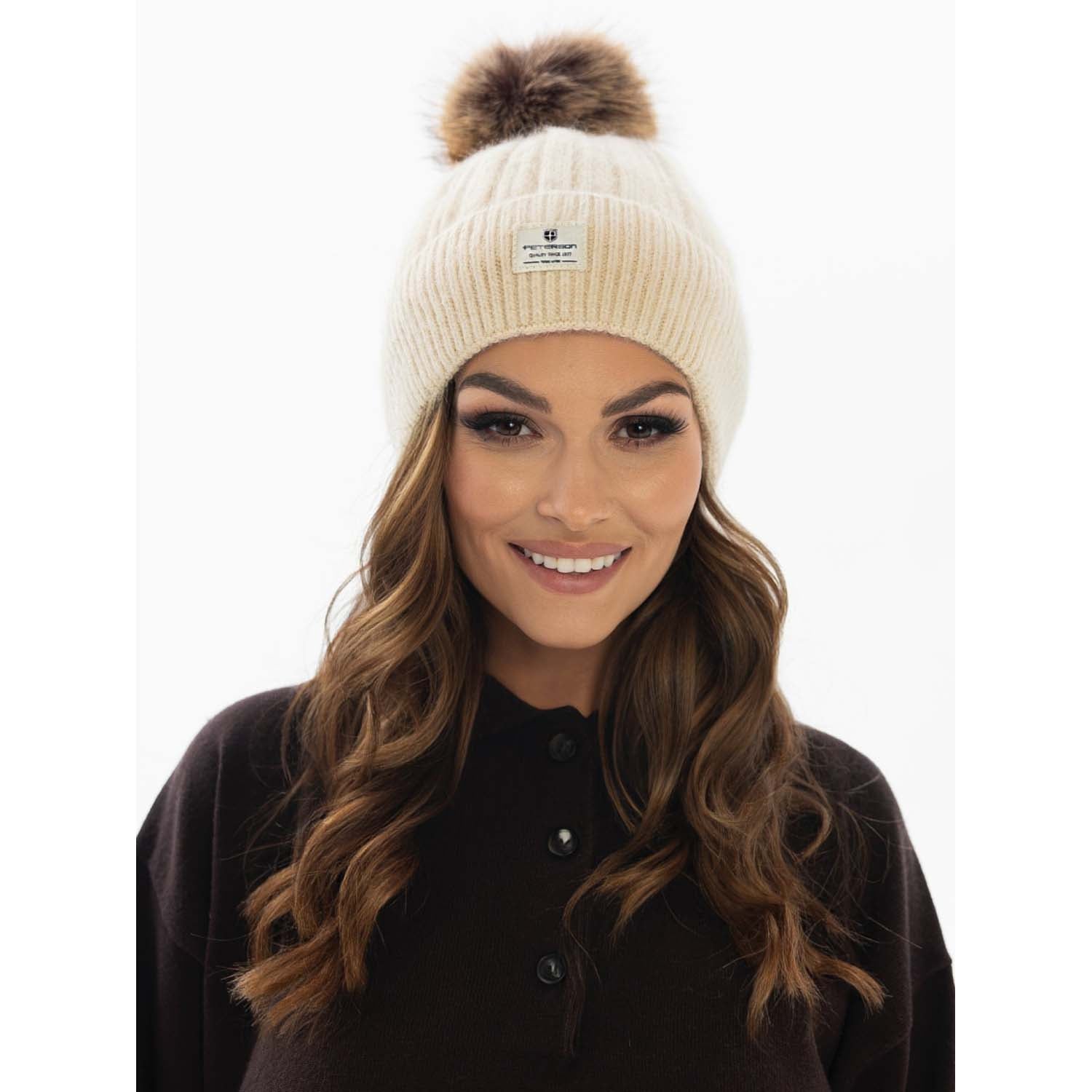 Sieviešu bēša ziemas cepure, kas izgatavota no angoras un akrila, ar noņemamu pompomu - silta un stilīga ikdienas pilsētvides stilam.