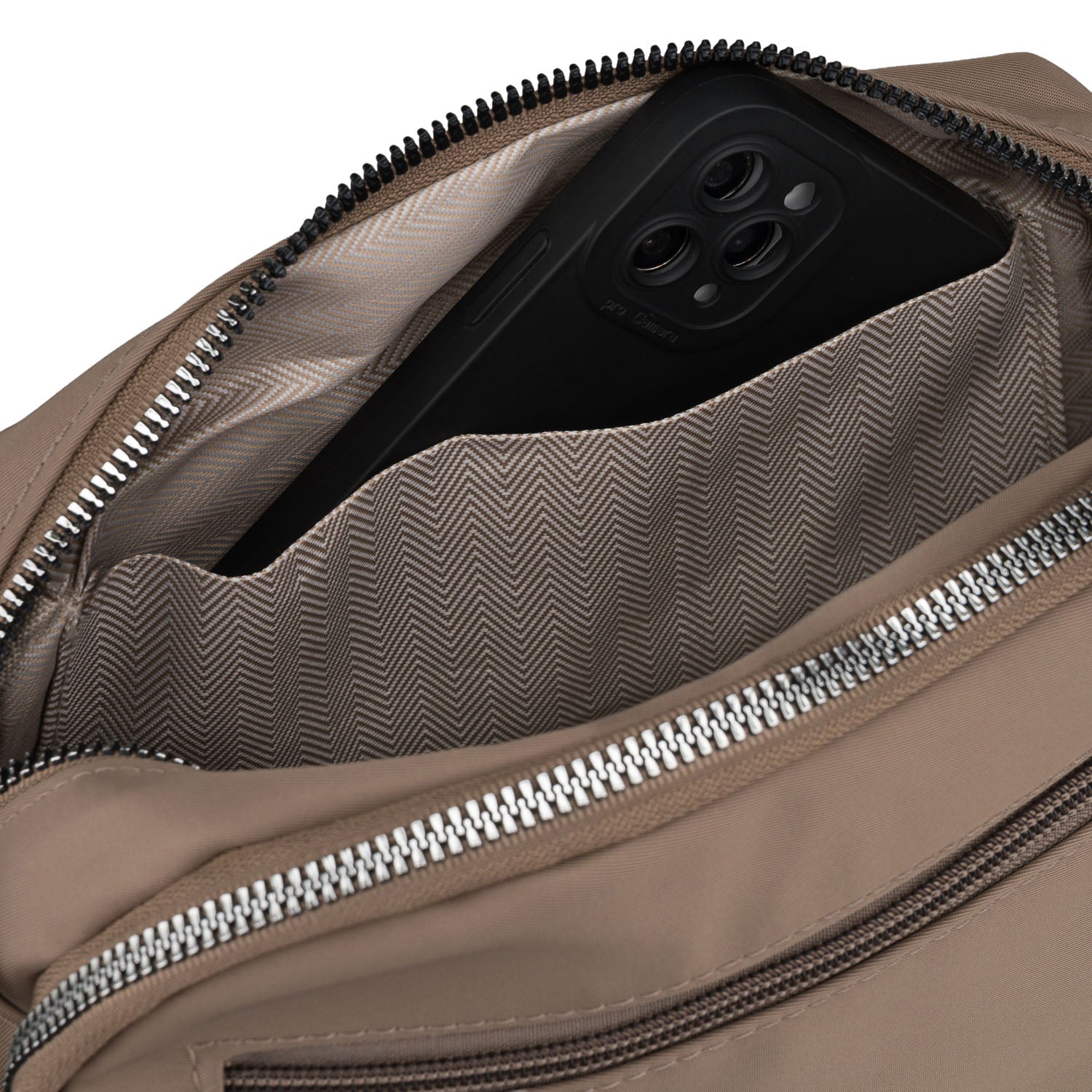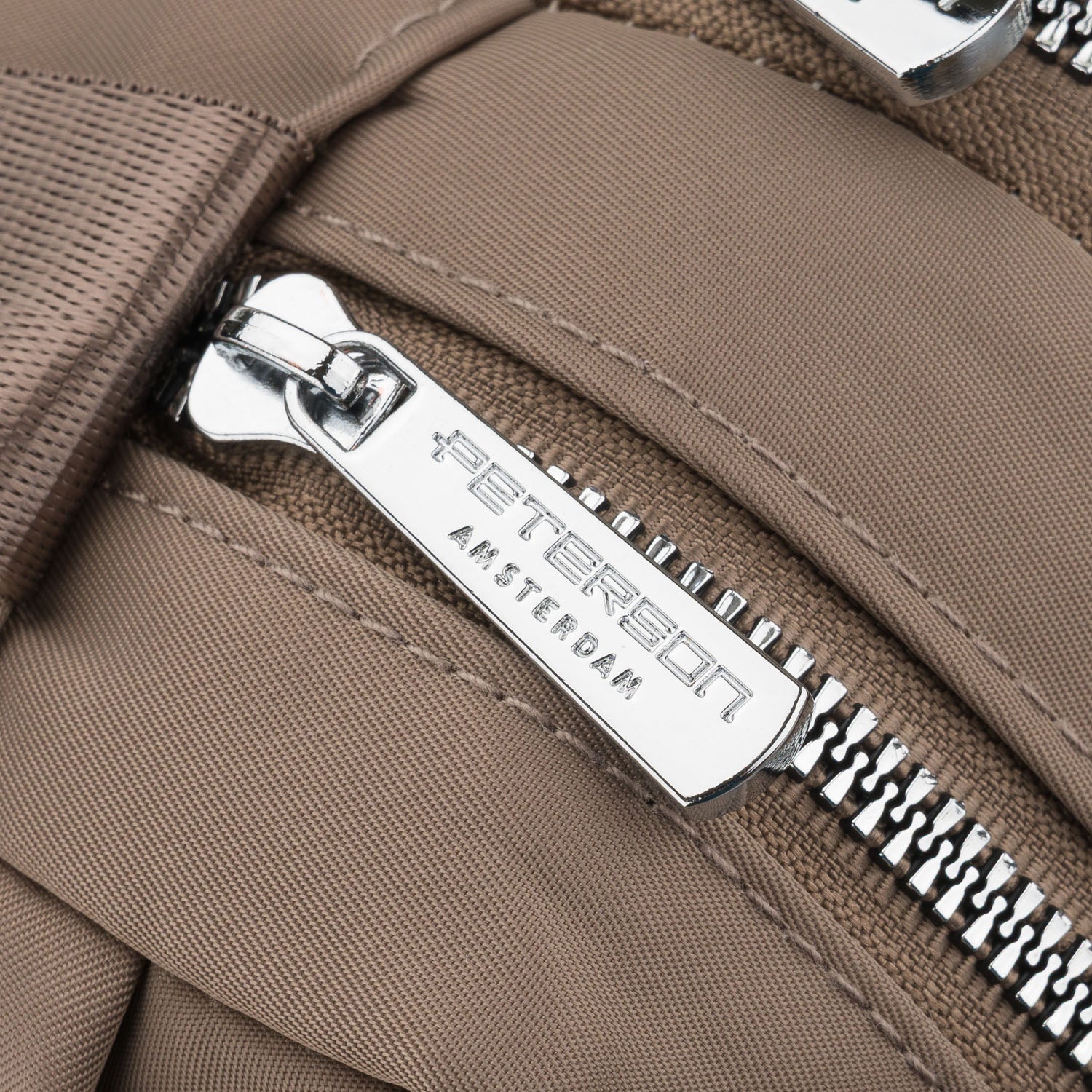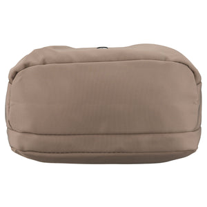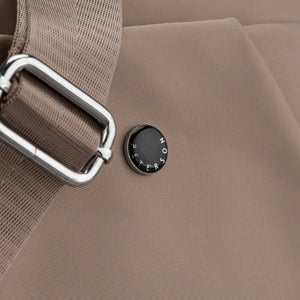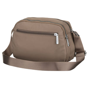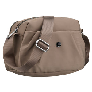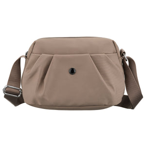 Smėlio spalvos moteriška crossbody rankinė iš poliesterio – kompaktiška kasdienė rankinė su keliais skyriais ir patogia nešiojimo per petį funkcija.