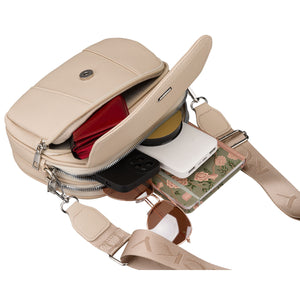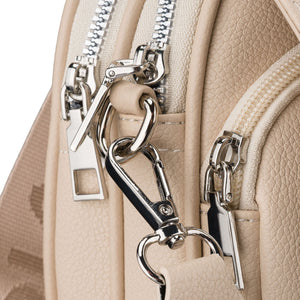 Smėlio spalvos moteriška crossbody tipo rankinė iš dirbtinės odos – kompaktiškas ir praktiškas pasirinkimas kasdienai, patogiai nešiojamas ant peties arba per kūną.