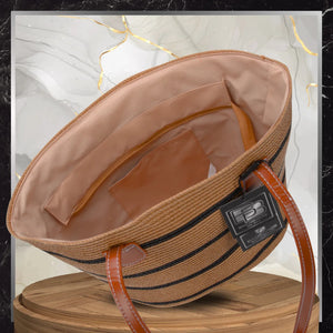 Šī elegantā sieviešu pludmales soma no Bad&Bags ir lieliska izvēle vasaras sezonai. Tā ir izgatavota no augstas kvalitātes austa sintētiska materiāla, dabīgā/bēšā krāsā ar brūniem elementiem, kas piešķir tai stilīgu izskatu.