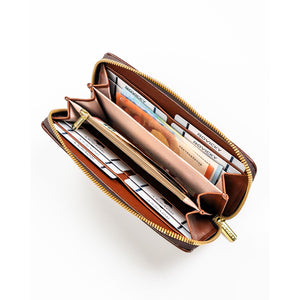 Didelė, horizontali moteriška piniginė–dėklas iš ekologiškos odos. Uždarymas užtrauktuku padeda saugiai laikyti turinį ir palaikyti tvarką.