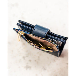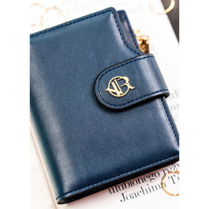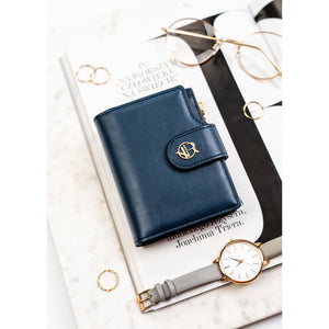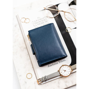 Tamsiai mėlyna moteriška piniginė iš ekologiškos odos, užsegama spaude ir užtrauktuku