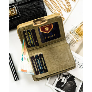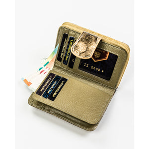 Auksinės spalvos moteriška vertikali piniginė iš natūralios ir ekologiškos odos