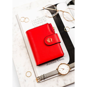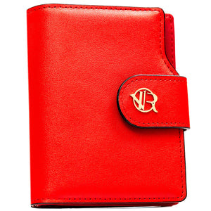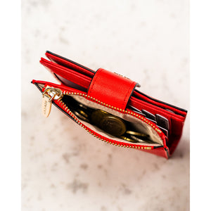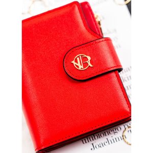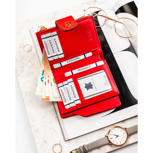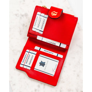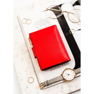 Vertikalus moteriškas piniginės tipo dėklas iš ekologiškos odos, raudonos spalvos. Uždarymas – spaudė ir užtrauktukas. Integruota RFID apsauga padeda sumažinti bekontakčių kortelių nuskaitymo riziką.