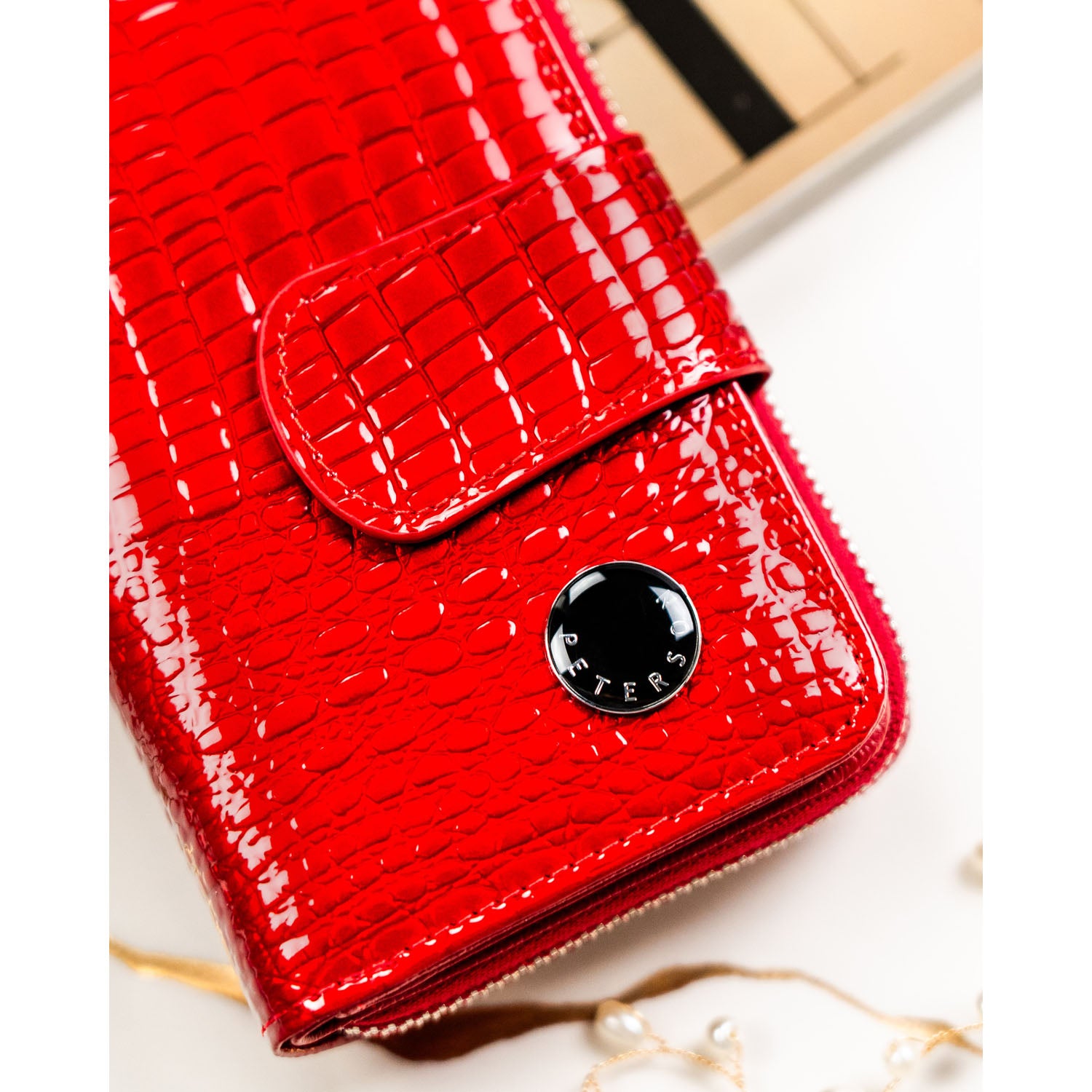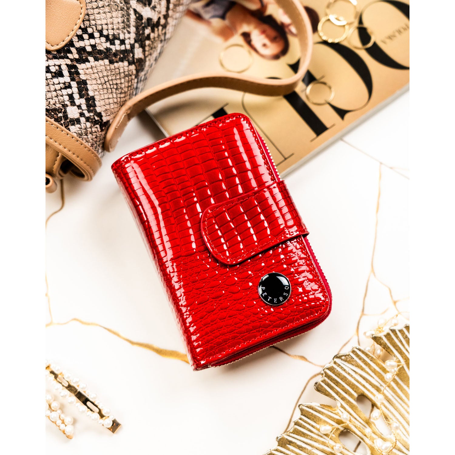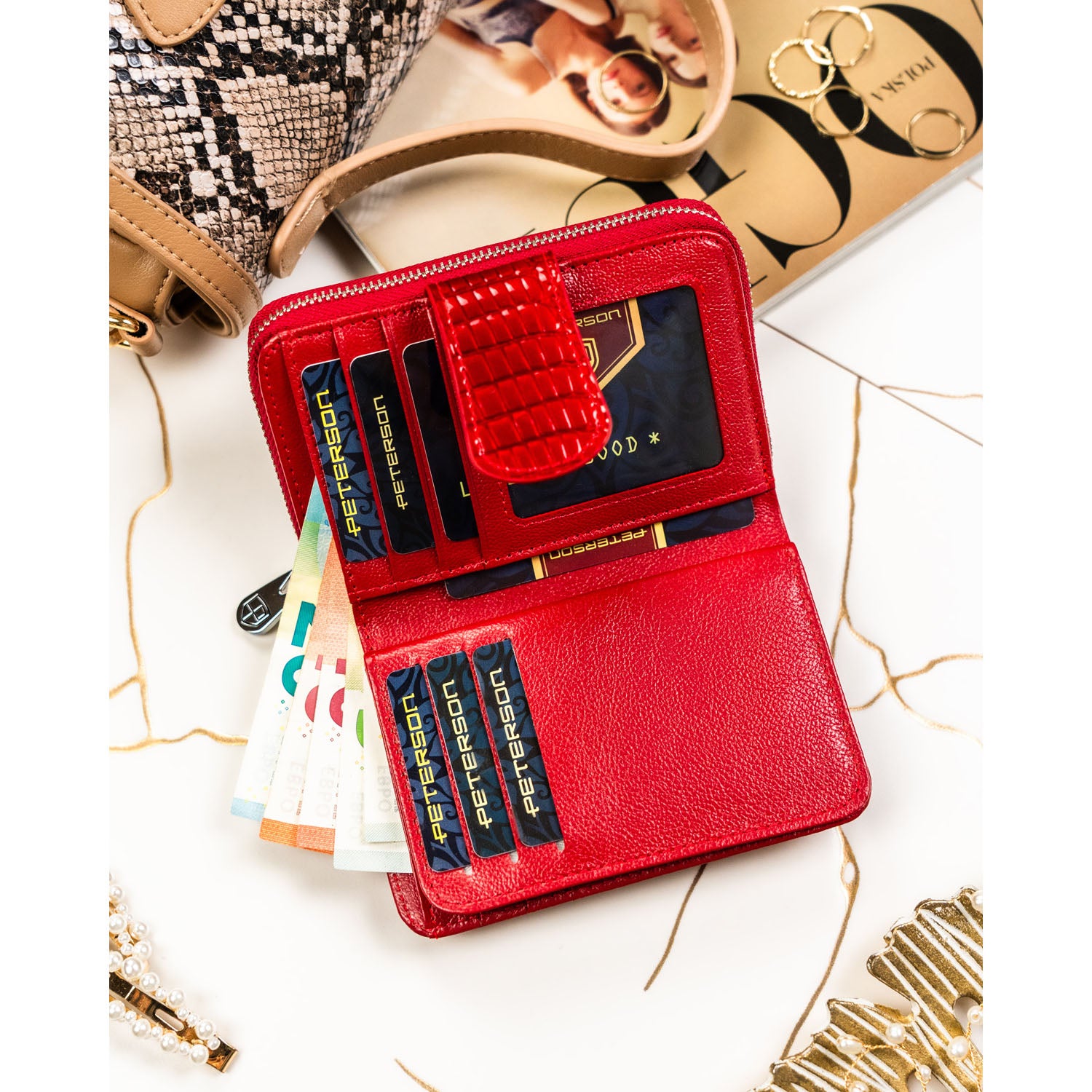 Moteriška raudona odinė piniginė Peterson – elegantiškas ir praktiškas vidutinio dydžio vertikalus modelis kasdieniam naudojimui. Kompaktiška forma, patogus vidaus išdėstymas ir integruota RFID apsauga užtikrina patogų ir saugų kortelių bei grynųjų laikymą.