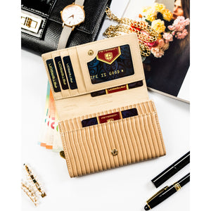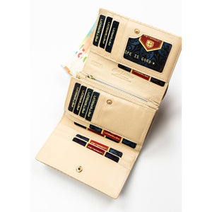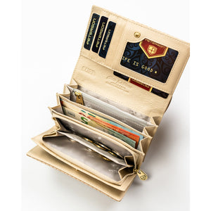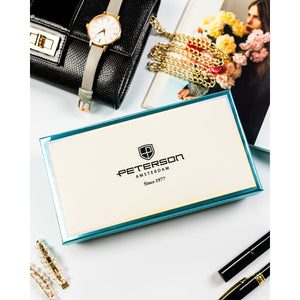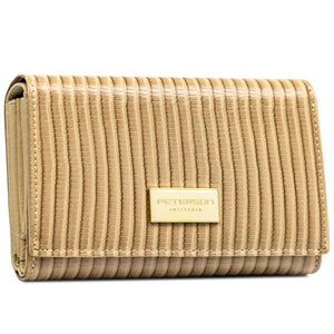 Peterson sieviešu maks, izgatavots no mākslīgās ādas, bēšā krāsā, ar aizdari un RFID aizsardzību.