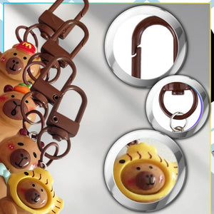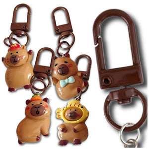 - **Krāsa un unikālās iezīmes**: Krāsas, kā parādīts fotoattēlos. Katram atslēgu piekariņam ir unikāls dizains, tostarp kapibara ar dažādiem aksesuāriem.