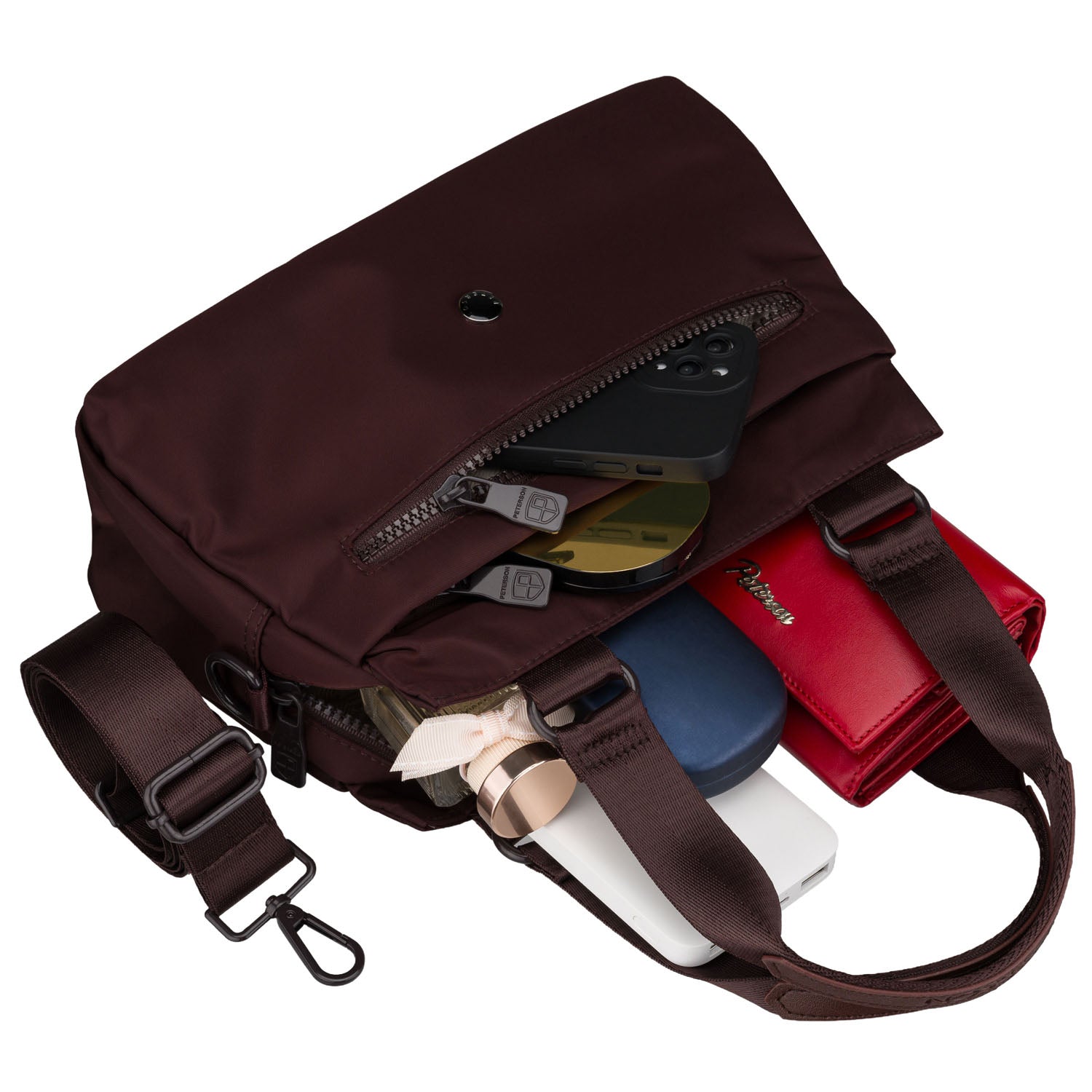 Bordo spalvos moteriška Peterson crossbody rankinė – vidutinio dydžio praktiška rankinė kasdienai.