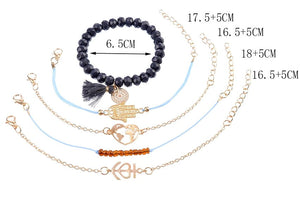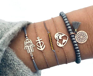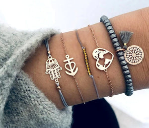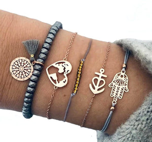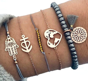 Bagātiniet savu rotaslietu kolekciju ar šo unikālo piecu rokassprādžu komplektu. Katra rokassprādze ir izgatavota no rotaslietu metāla, pērlītēm un auklas, piešķirot tām unikālu stilu un eleganci.