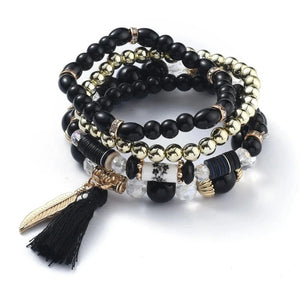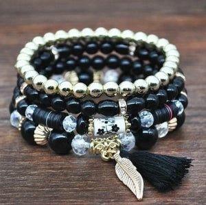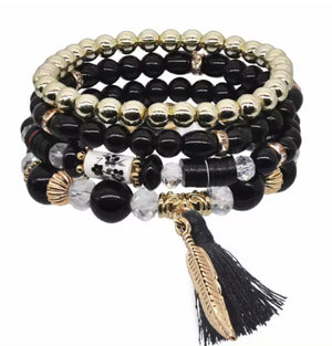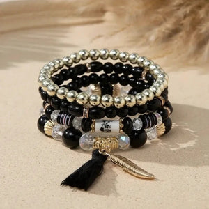 Šis elegantais rokassprādžu komplekts sastāv no četrām pērlīšu aprocēm, kas izgatavotas uz elastīgas lentes, kas nodrošina ērtu valkāšanu.