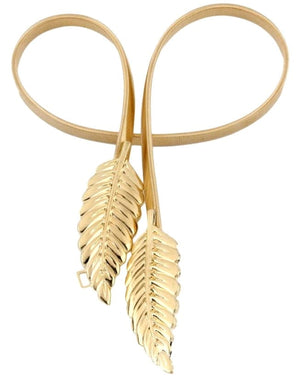 Šī elegantā zelta josta ar atsperes mehānismu un dekoratīvu lapiņu ir lielisks aksesuārs, kas piešķir stilu un ekskluzivitāti.