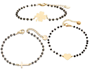 Šis rokassprādžu komplekts ir ideāla izvēle sievietēm, kuras novērtē modernu dizainu un augstu kvalitāti. Katru rokassprādzi izceļ spīdīgas melnas pērlītes, kas tai piešķir unikālu šarmu. Papildu 5 cm pagarinājums ļauj viegli pielāgot rokassprādzes dažādiem plaukstas locītavas izmēriem.
