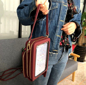 - Pirmais nodalījums: ar rāvējslēdzēju, ar papildu nodalījumu iekšpusē. Ārpusē ir folijas lodziņš, kas ļauj kontrolēt tālruni, neizņemot to no somas.