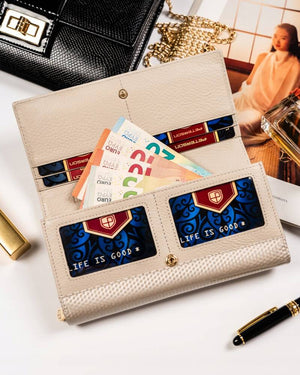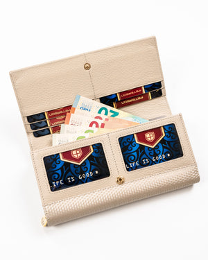 Šis elegantais sieviešu maks, kas izgatavots no īstas ādas, ir lieliska izvēle tiem, kas novērtē kvalitāti un funkcionalitāti. Ar vairāk nekā 20 karšu nodalījumiem un atsevišķu nodalījumu monētām tas nodrošina ērtu un organizētu priekšmetu glabāšanu. Bēšā krāsa piešķir smalkumu un stilu, un lielais izmērs ļauj ērti ievietot visas nepieciešamās lietas.