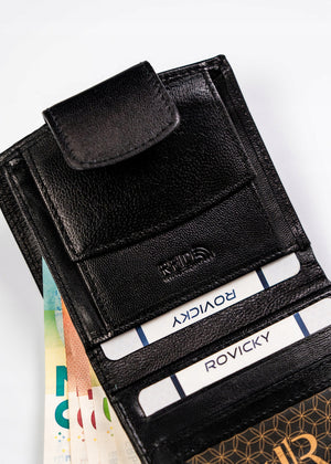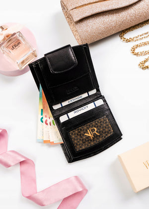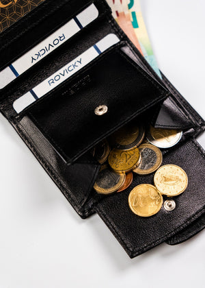 Šis elegantais un funkcionālais sieviešu maks no Rovicky ir izgatavots no augstas kvalitātes īstas ādas. Melnā krāsa nodrošina klasisku un daudzpusīgu stilu, kas piemērots jebkuram gadījumam. Makam ir 6-10 karšu nodalījumi, kas padara to ideāli piemērotu ikdienas lietošanai. Kompaktie izmēri ļauj to viegli ievietot rokassomiņā vai kabatā.