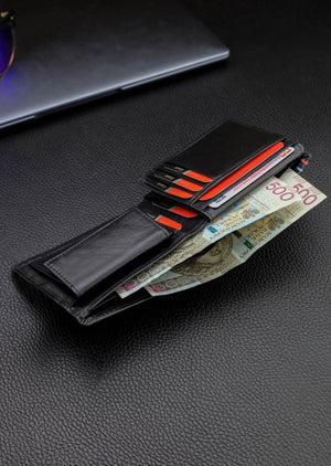 Izgatavots no dabīgās ādas – gluda, smalki spīdīga un izturīga lietošanā. Ārpusē – bez ārējās aizdares (tīrs siluets), iekšpusē – monētu kabata ar sprādzi. Krāsa – melna.