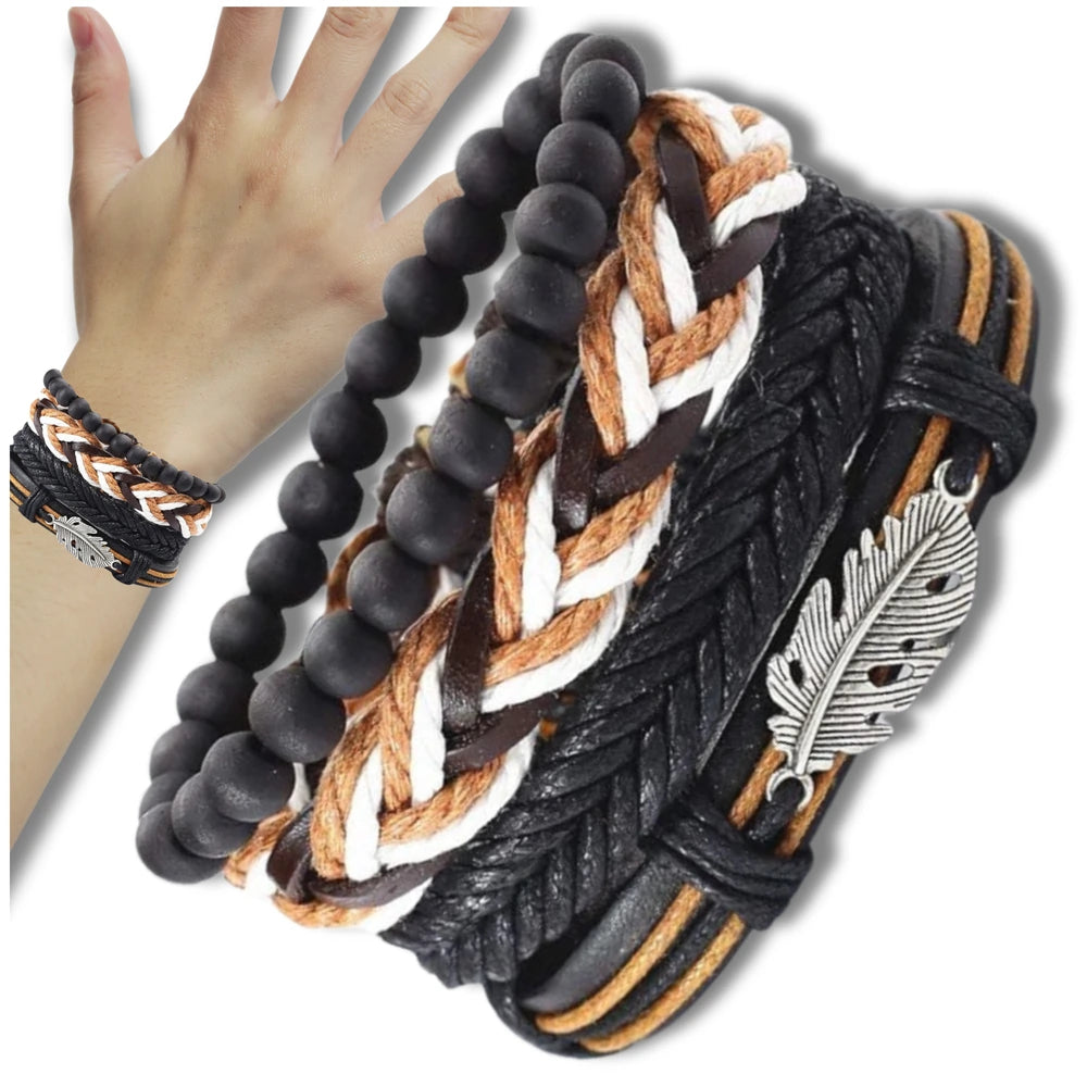 Šis rokassprādžu komplekts ir lieliski piemērots vīriešiem, kuri novērtē brīvu, boho stilu un izteiksmīgu dizainu. Rokassprādzes ir regulējamas, tāpēc tās der lielākajai daļai plaukstas locītavu, nodrošinot komfortu visas dienas garumā. Komplekts sastāv no melnām pērlītēm un pītiem elementiem dabiskos brūnos, baltos un melnos toņos, piešķirot stilīgu un dabisku izskatu. Spalvas formas kulons piešķir eleganci un ekskluzivitāti.
