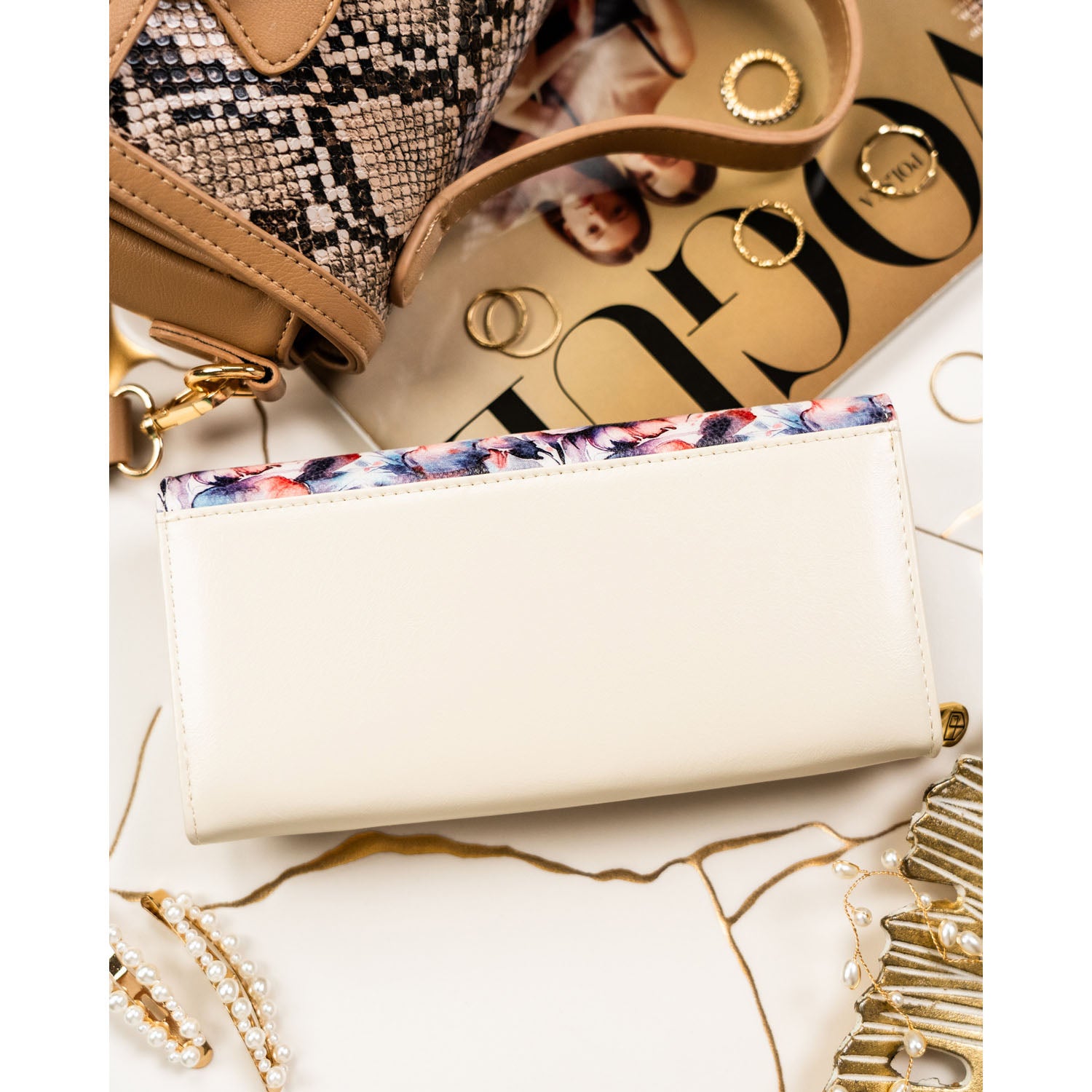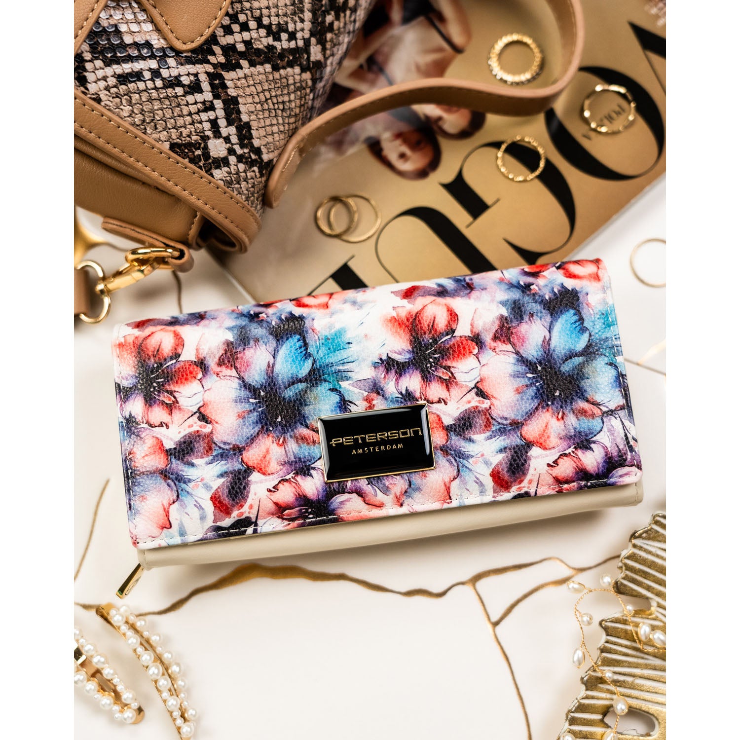 Peterson sieviešu maks, kas izgatavots no mākslīgās ādas, bēšā krāsā ar ziedu rakstu.