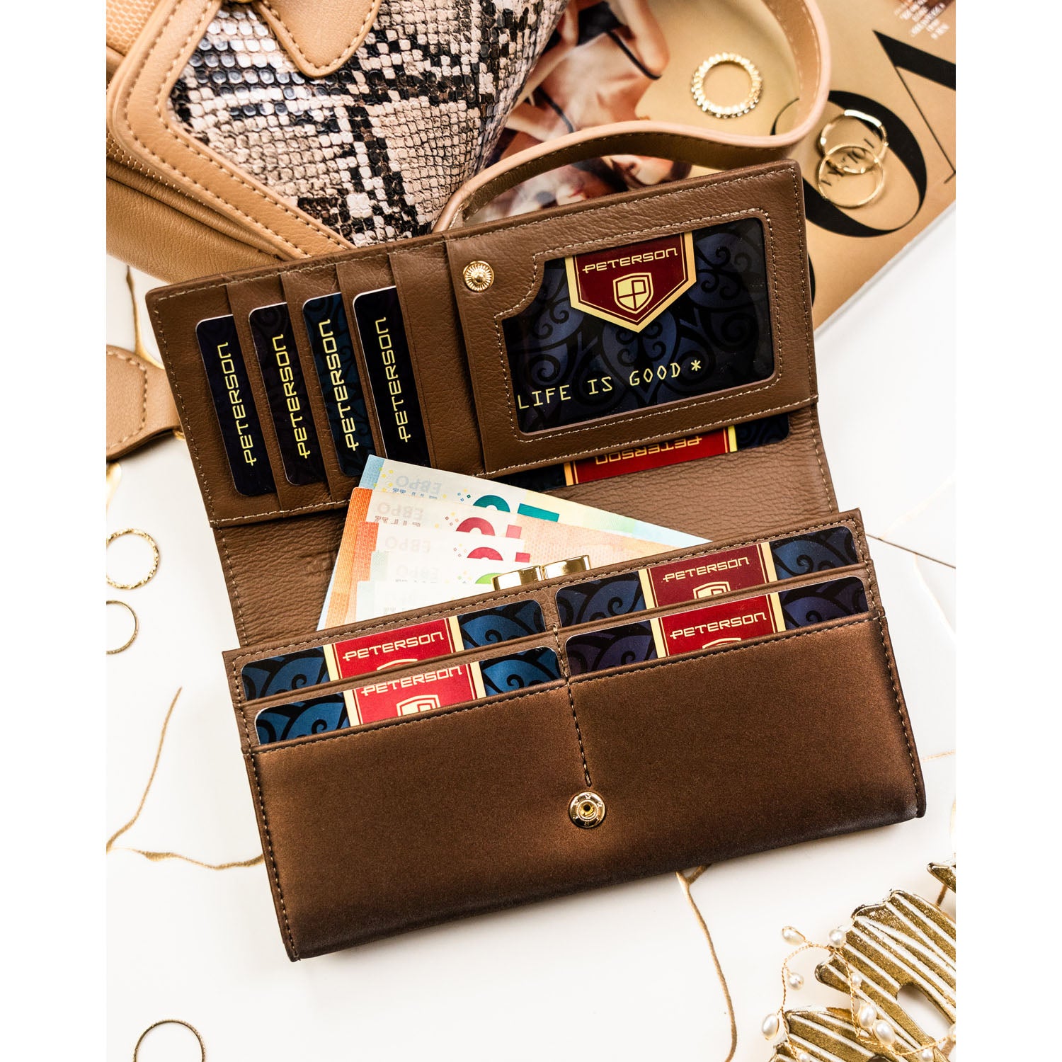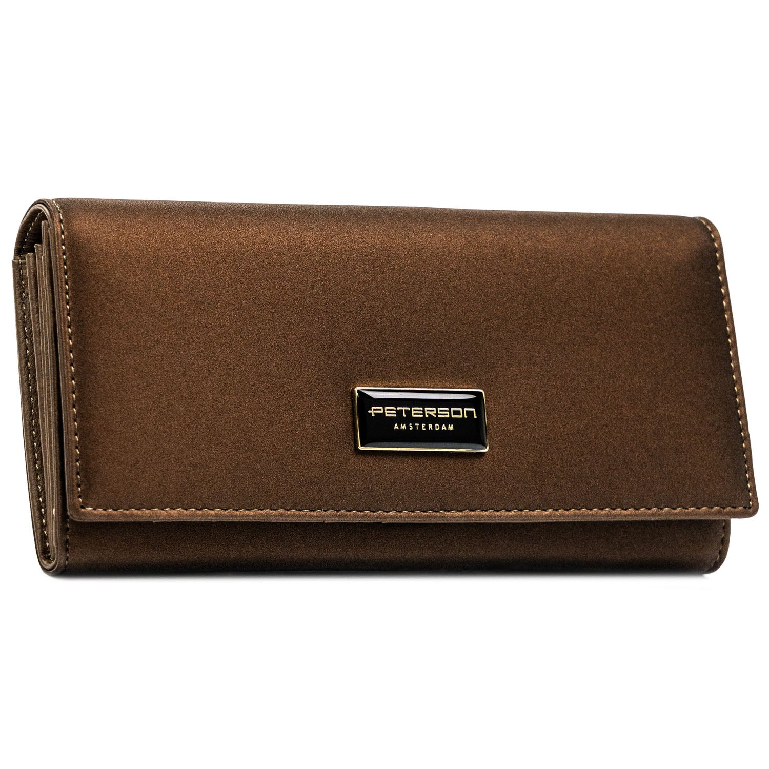 Peterson sieviešu maks, izgatavots no mākslīgās ādas, brūnā krāsā, ar RFID aizsardzību.