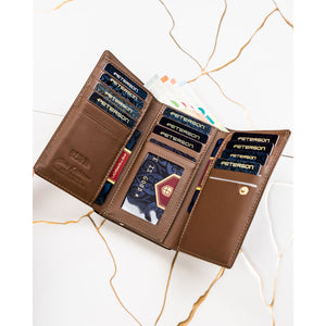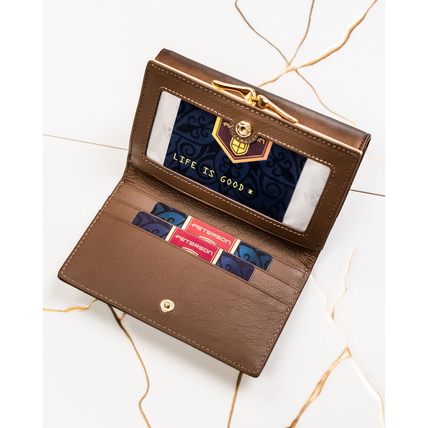 Peterson sieviešu maks, izgatavots no mākslīgās ādas, brūnā krāsā, ar RFID aizsardzību.
