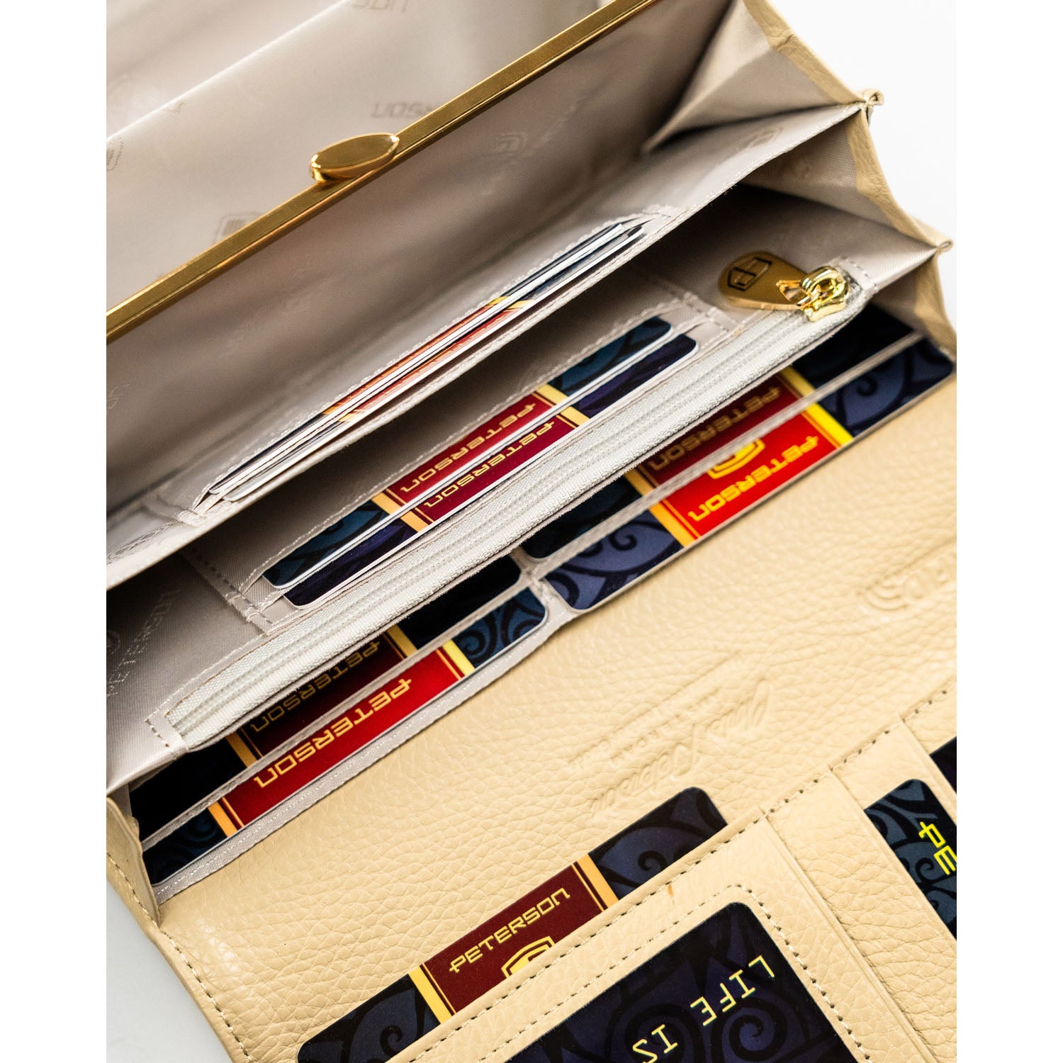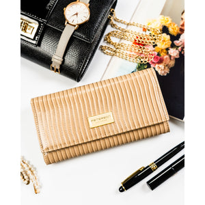 Peterson sieviešu maks, izgatavots no mākslīgās ādas, bēšā krāsā, ar RFID aizsardzību.