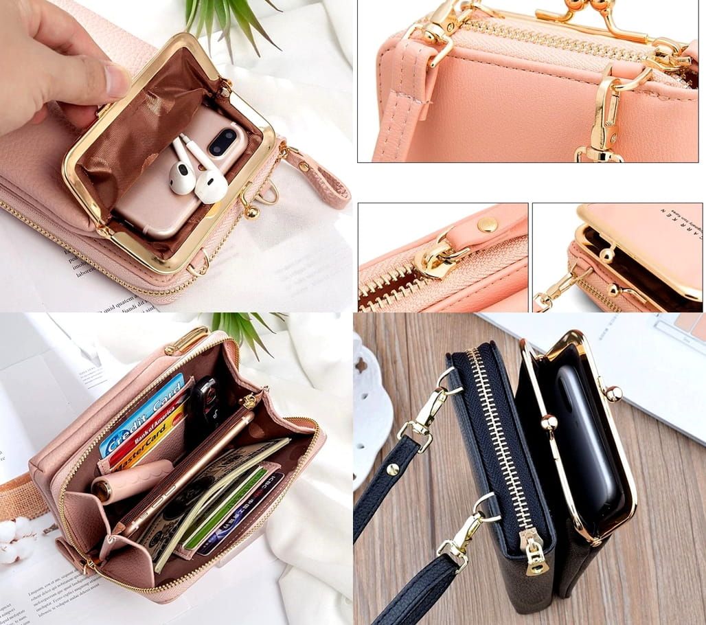 Šis elegantais mini maks un somiņa ir ideāls risinājums sievietēm, kuras vēlas visu glabāt vienuviet. Tas ir piemērots lielākajai daļai viedtālruņu, piemēram, iPhone, Samsung, Xiaomi, Huawei, Sony, Panasonic, LG un Nokia.