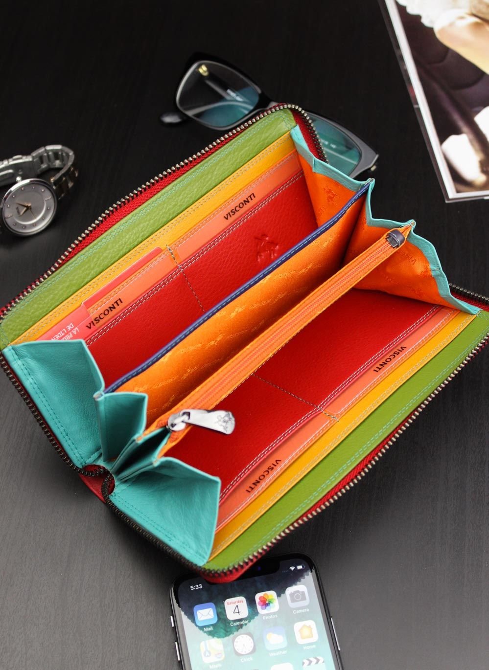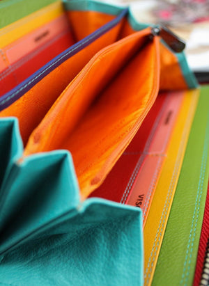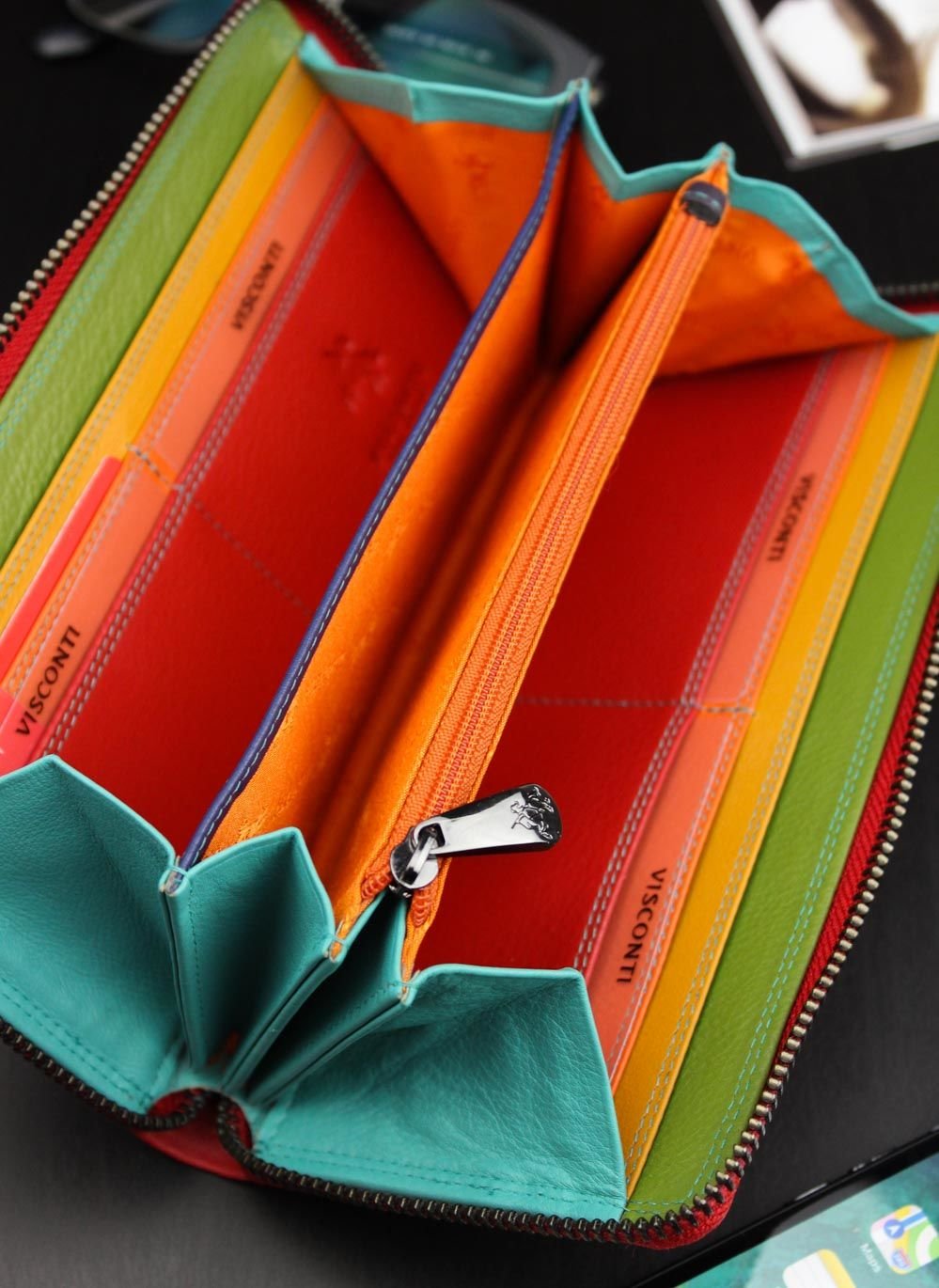 Šis sieviešu maks no britu zīmola Visconti izceļas ar savu eleganci un unikālo dizainu. Klasiska melna apdare slēpj modernu varavīksnes krāsu iekšpusi, piešķirot makam unikālu izskatu. Maks ir pilnībā aiztaisāms ar unikālu rāvējslēdzēju, un iekšpusē esošā aizdare nodrošina papildu drošību banknotēm.