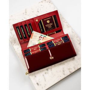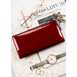 Šis elegantais sieviešu maks ir izgatavots no īstas lakotas ādas, kas piešķir tam greznību un izturību. Spilgti sarkanā krāsa un zelta detaļas piešķir ekskluzivitāti, savukārt horizontālais dizains nodrošina ērtu ikdienas lietošanu.