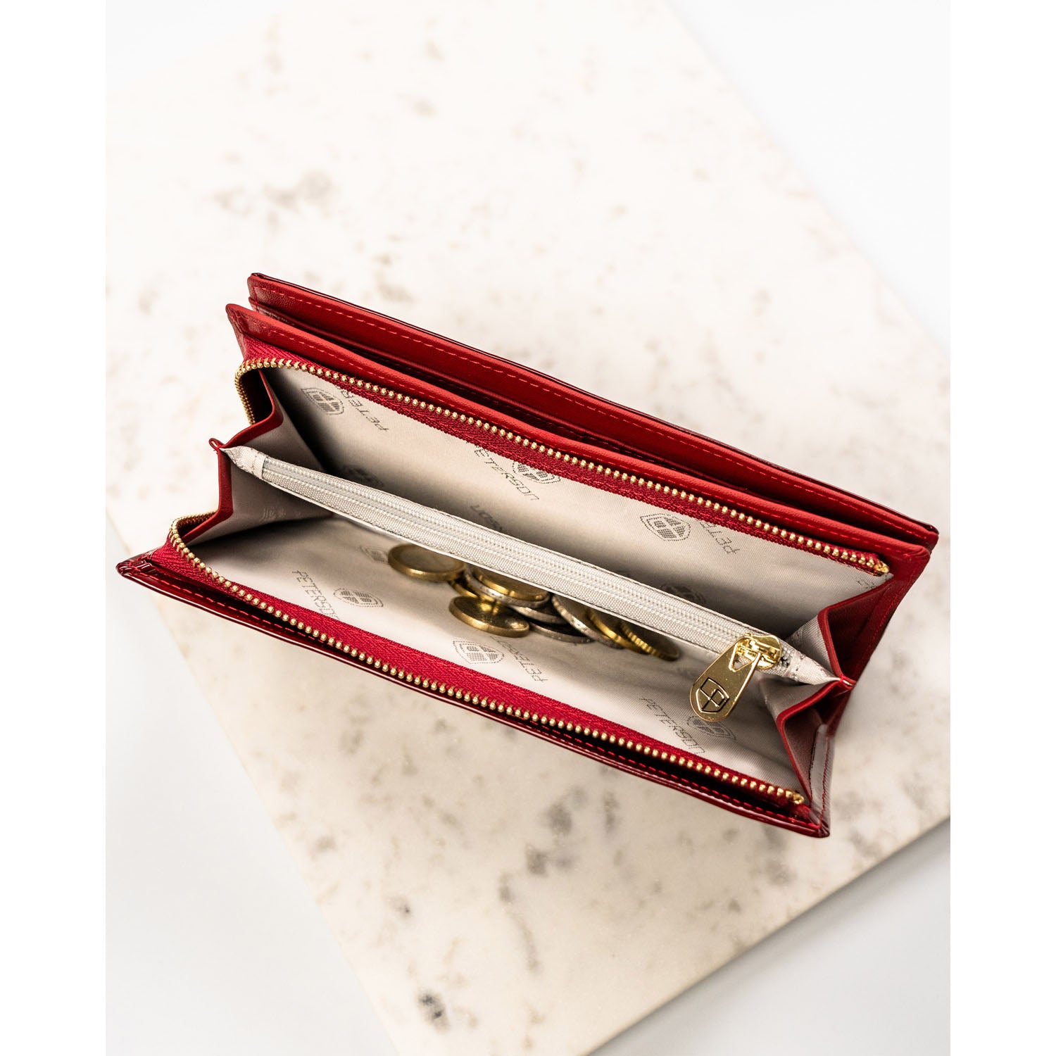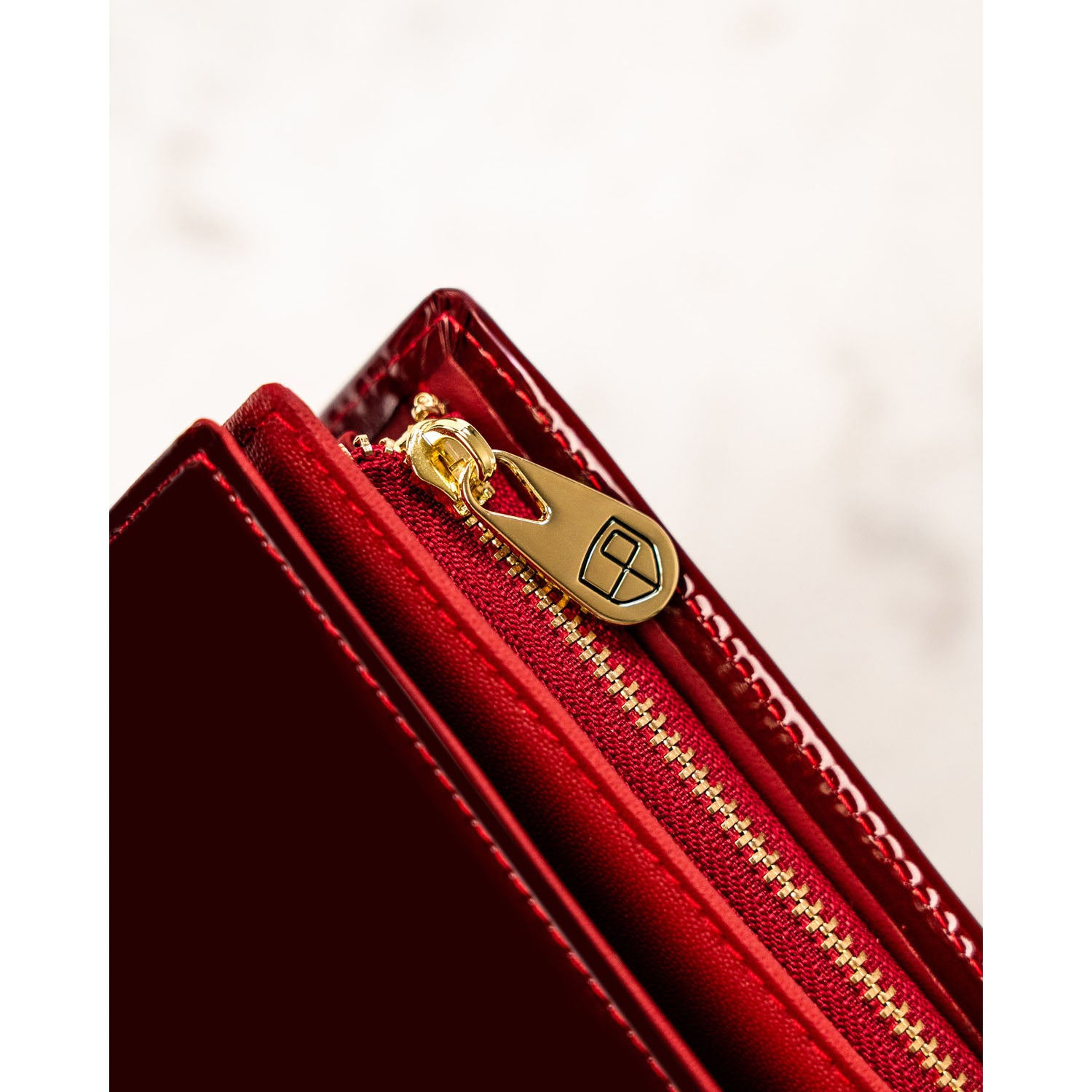 Šis elegantais sieviešu maks ir lieliska izvēle pilsētvides un ikdienas stilam. Izgatavots no īstas lakotas ādas, tas izceļas ar spilgti sarkanu krāsu un zelta detaļām, piešķirot tam greznības sajūtu.
