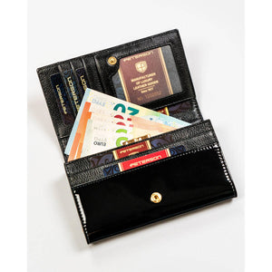 Šis maks ne tikai glabā visas jūsu svarīgākās kartes, bet arī aizsargā tās no nevēlamas skenēšanas, pateicoties iebūvētajai RFID aizsardzībai . Tā klasiskā melnā krāsa un lielais izmērs būs lieliski piemērots gan ikdienas lietošanai, gan īpašiem gadījumiem.