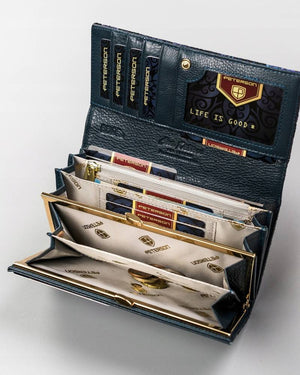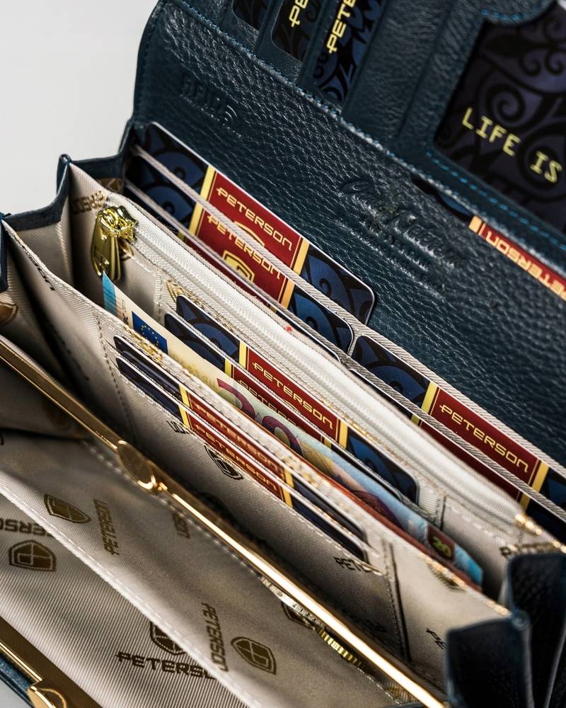 Šis elegantais sieviešu maks no Peterson ir izgatavots no augstas kvalitātes īstas ādas, kas nodrošina izturību un stilīgu izskatu. Zilā krāsa piešķir tam modernu un izsmalcinātu izskatu.