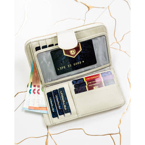 Šajā makā var ievietot ne tikai vairāk nekā 15 kartes, bet arī jūsu dati ir drošībā, pateicoties iebūvētajai RFID aizsardzībai. Tā lielais izmērs ļauj ērti uzglabāt visas nepieciešamās lietas, un bēšā krāsa piešķir eleganci un daudzpusību.