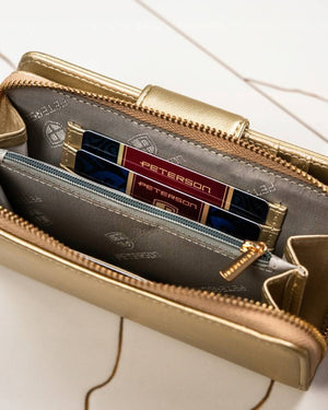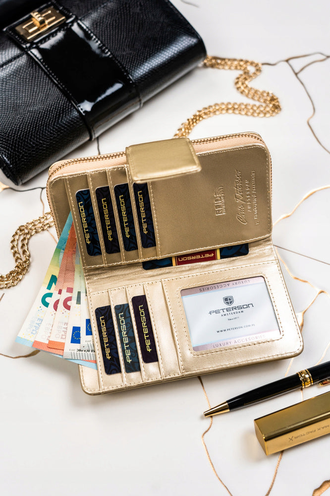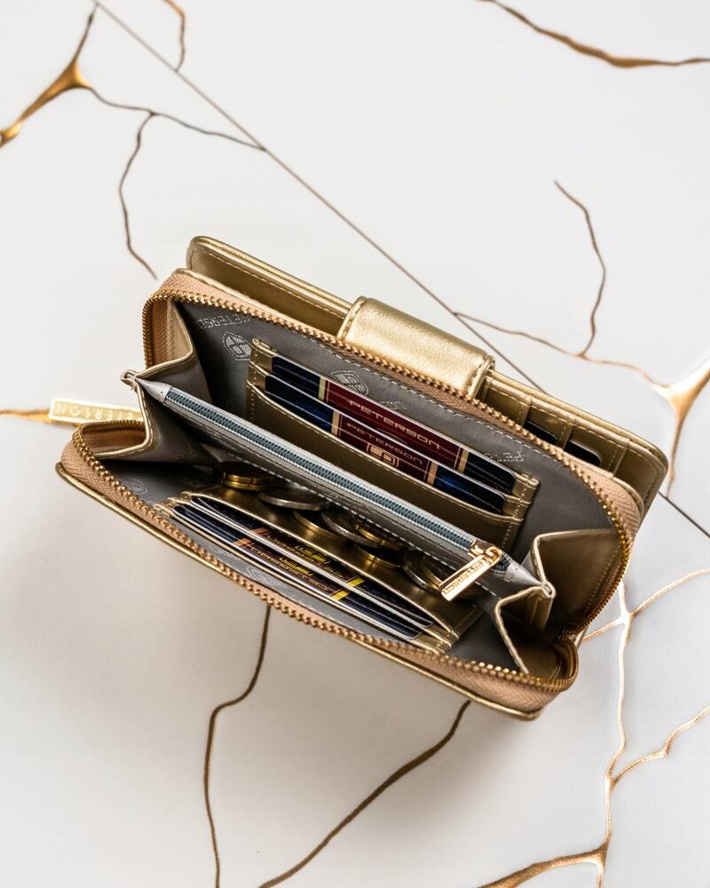 Šis elegantais sieviešu maks no Peterson kolekcijas ir lieliska izvēle tiem, kas novērtē stilu un funkcionalitāti. Zelta krāsa piešķir greznības pieskārienu, savukārt lielais izmērs nodrošina pietiekami daudz vietas visām nepieciešamajām lietām. Ar vairāk nekā 10 karšu nodalījumiem un RFID aizsardzību šis maks ir ne tikai stilīgs, bet arī drošs.