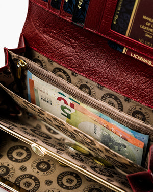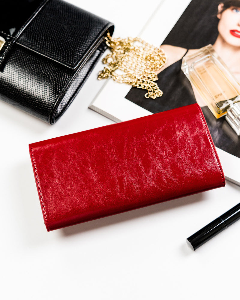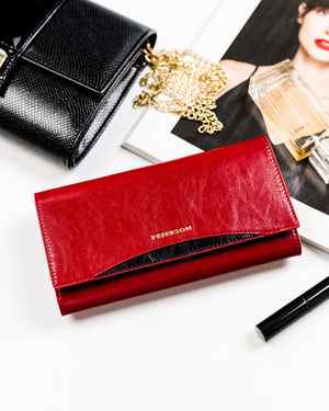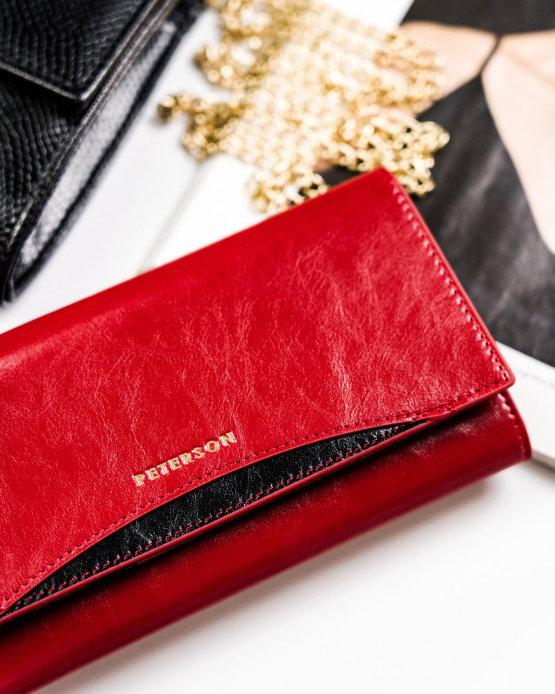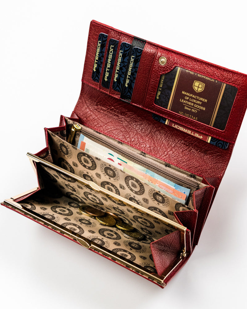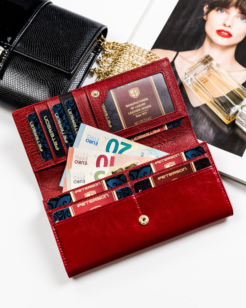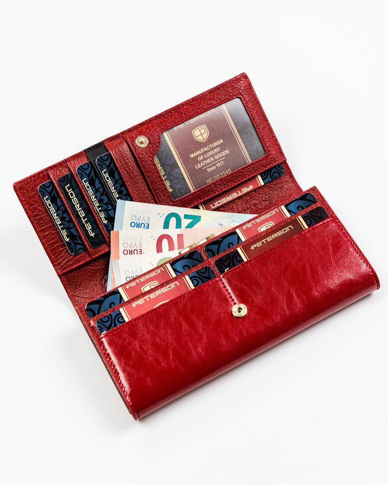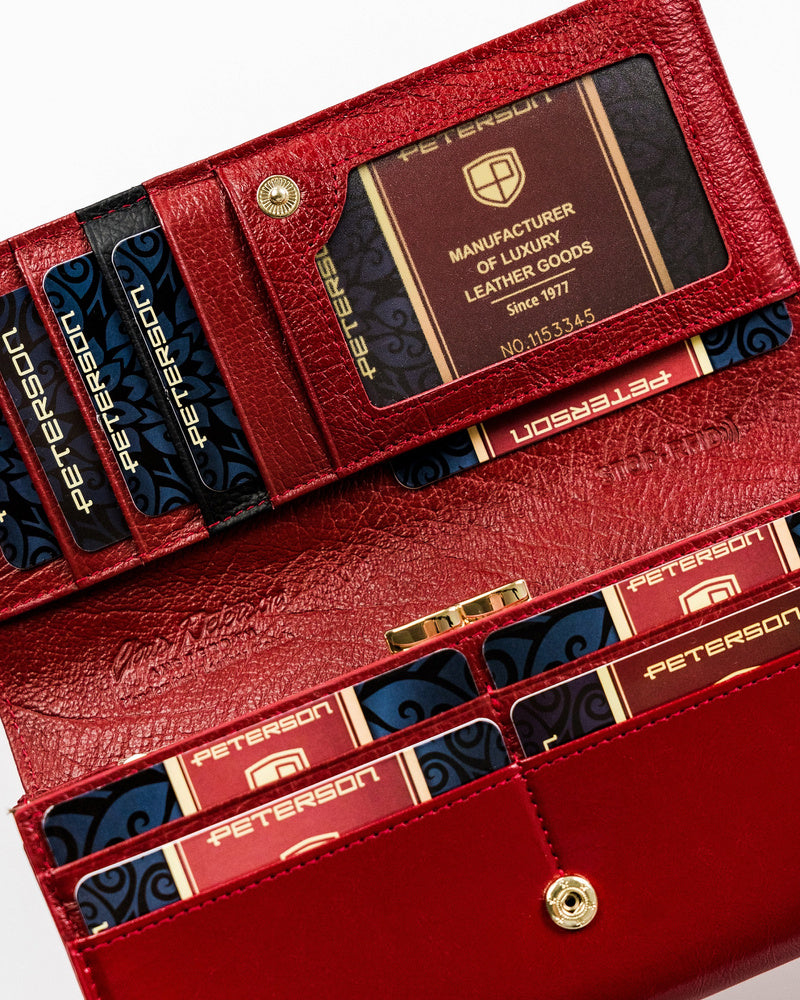 Šis elegantais sieviešu maks no Peterson kolekcijas ir izgatavots no augstas kvalitātes īstas ādas. Sarkanā krāsa piešķir tam izsmalcinātību un stilu, un lielais izmērs nodrošina pietiekami daudz vietas visām nepieciešamajām lietām. Ar 6-10 karšu nodalījumiem un atsevišķu nodalījumu monētām šis maks ir praktisks un ērts ikdienas lietošanai.
