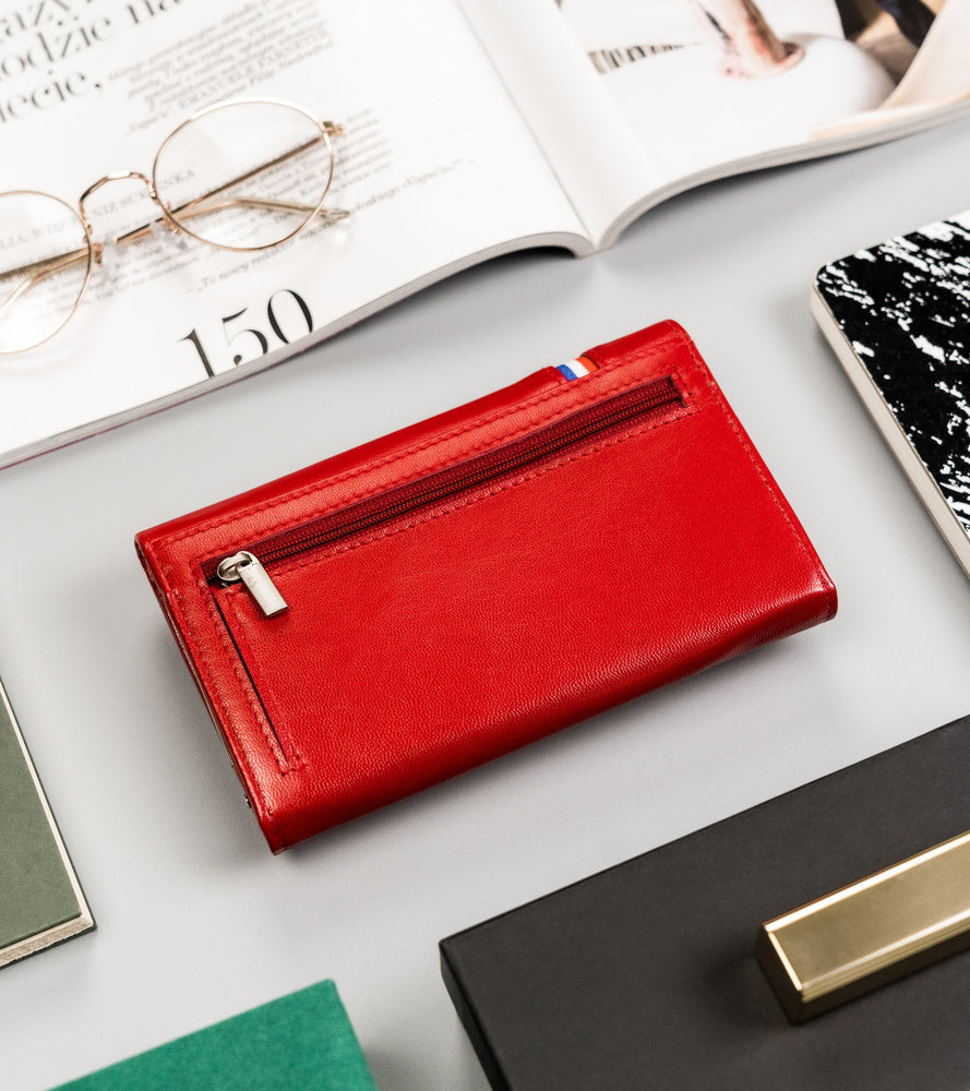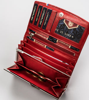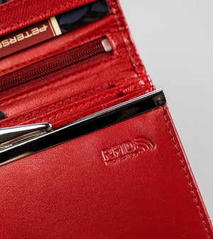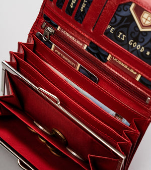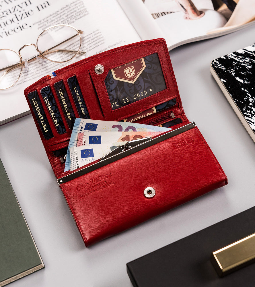 Šis elegantais sieviešu maks no Peterson kolekcijas ir izgatavots no augstas kvalitātes īstas ādas. Sarkanā krāsa piešķir ekskluzivitāti un stilu, un lielais izmērs nodrošina, ka jums būs pietiekami daudz vietas visām jūsu mantām. Makam ir 1-5 karšu nodalījumi un atsevišķs nodalījums monētām, padarot to praktisku un ērtu ikdienas lietošanai.