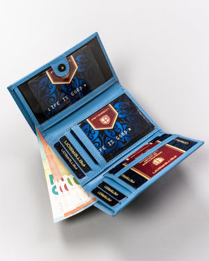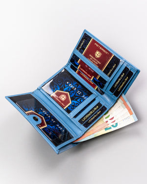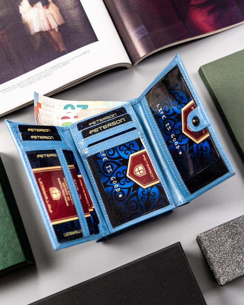 Šis elegantais sieviešu maks no Peterson kolekcijas ir izgatavots no augstas kvalitātes īstas ādas. Tā vidējais izmērs un funkcionālais dizains ir lieliski piemērots ikdienas lietošanai. Zilā krāsa piešķir stilu, savukārt daudzie karšu nodalījumi un atsevišķs nodalījums monētām nodrošina ērtu mantu organizēšanu.