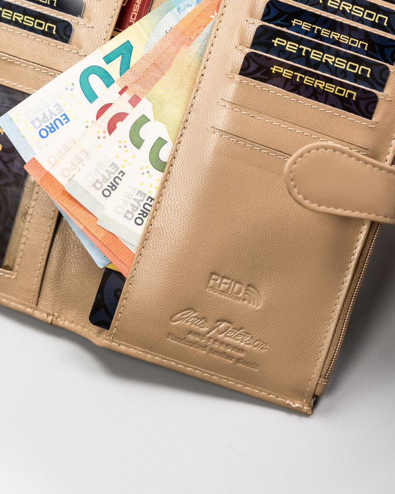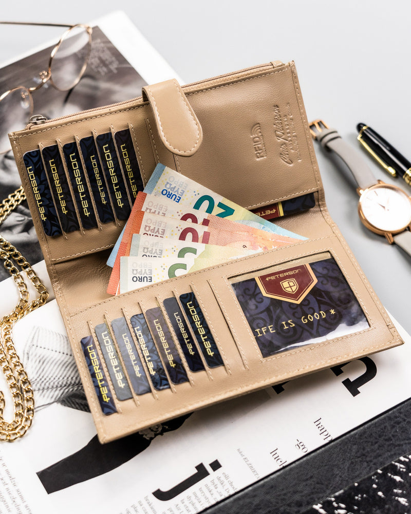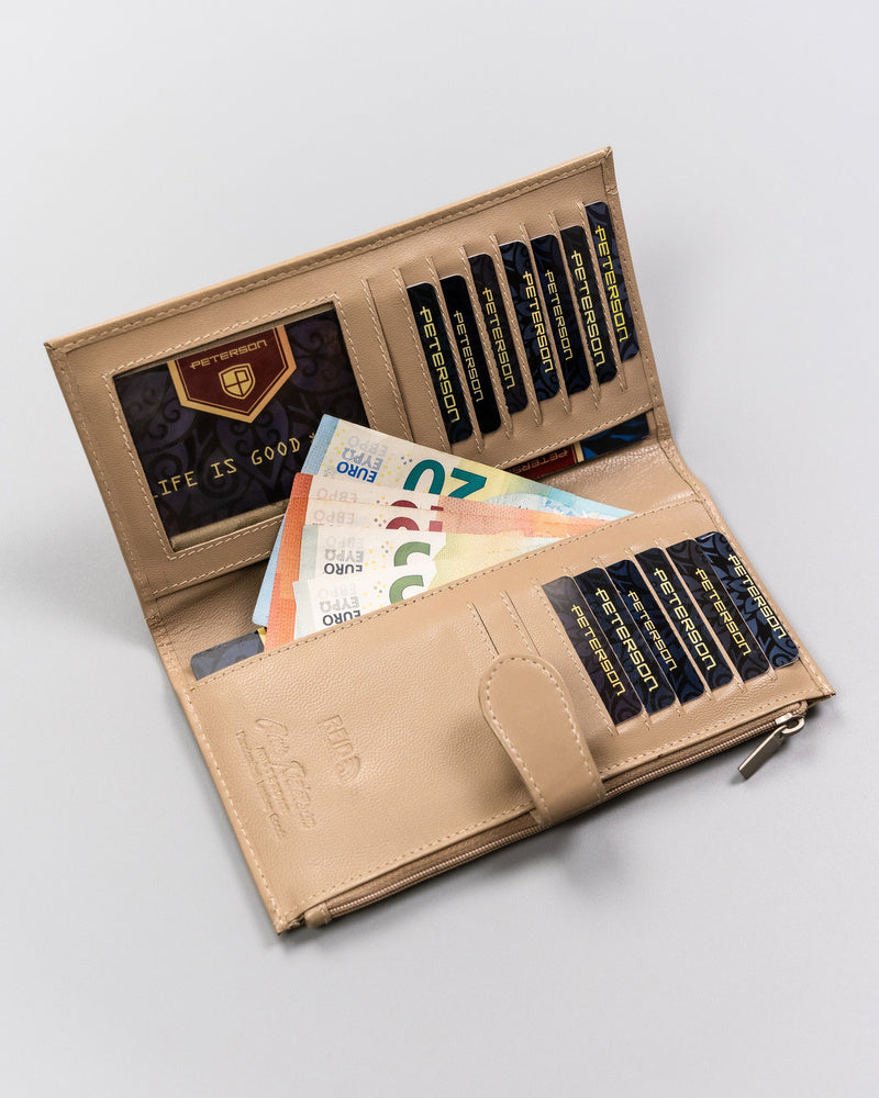 Šis elegantais sieviešu maks no Peterson kolekcijas ir lieliska izvēle tiem, kas novērtē kvalitāti un funkcionalitāti. Izgatavots no īstas ādas, tas ne tikai izskatās grezni, bet arī ir izturīgs. Bēšā krāsa nodrošina daudzpusību, tāpēc maks lieliski iederēsies dažādos stilos. Lielais izmērs un vairāk nekā 15 karšu nodalījumi nodrošina, ka jums vienmēr būs pietiekami daudz vietas visām nepieciešamajām lietām.