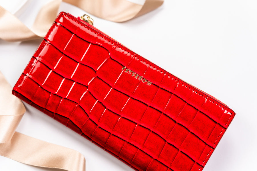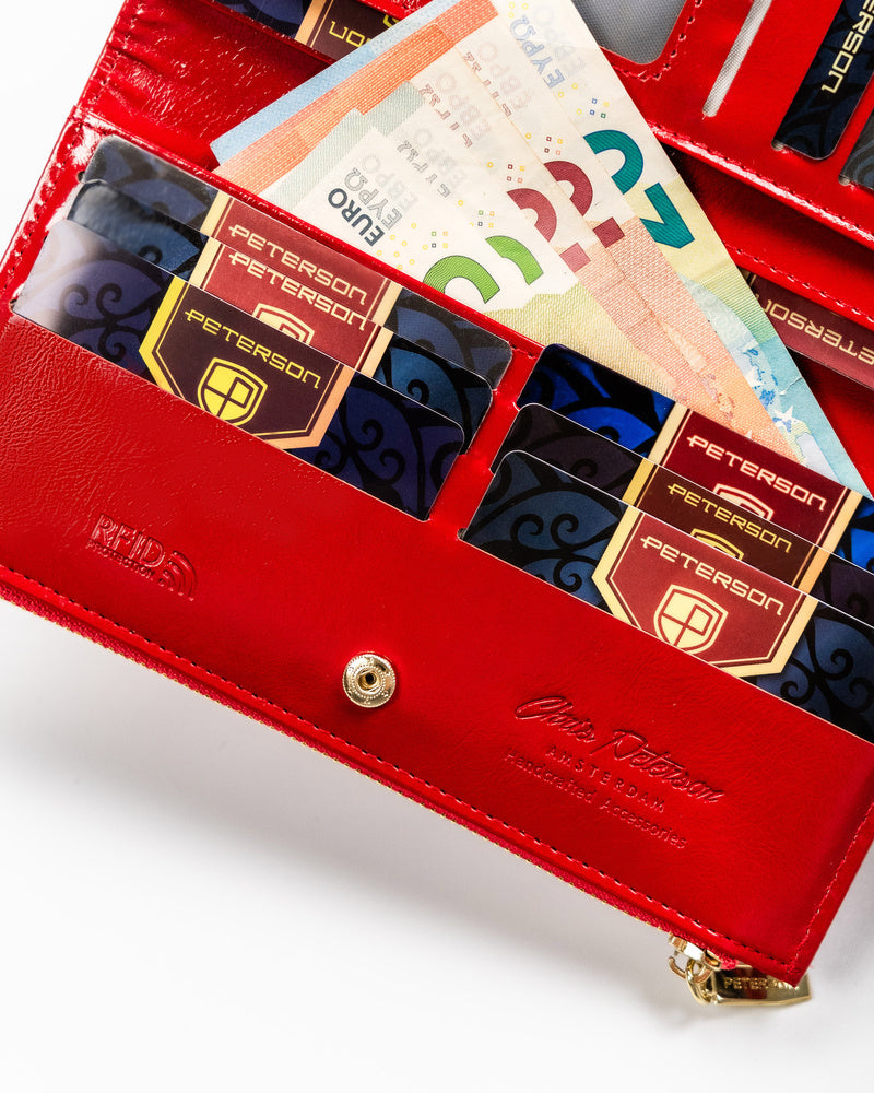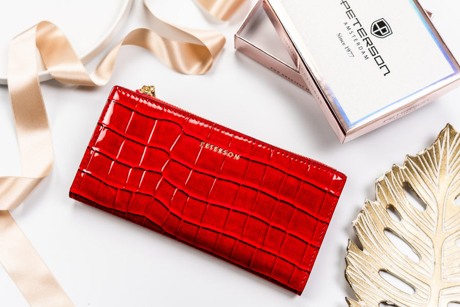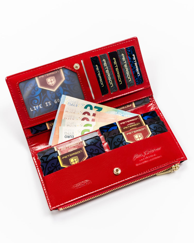 Šis elegantais sieviešu maks no Peterson kolekcijas ir lieliska izvēle tiem, kas novērtē kvalitāti un stilu. Izgatavots no lakotas ādas, tas ne tikai izskatās grezni, bet arī ir izturīgs. Sarkanā krāsa piešķir izsmalcinātību, un lielais izmērs nodrošina, ka viss nepieciešamais atrodas vienuviet.