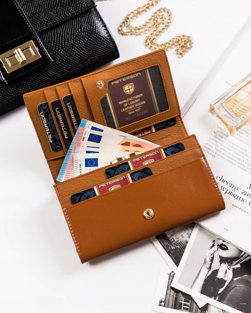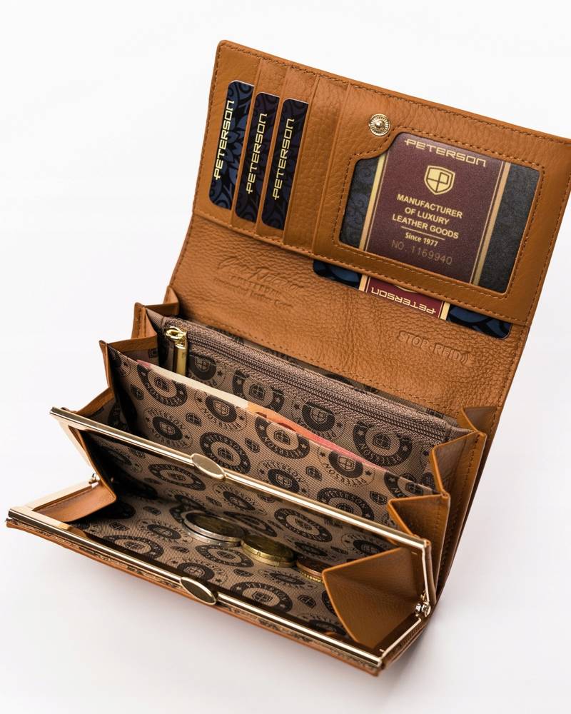 Šis elegantais sieviešu maks no Peterson kolekcijas ir izgatavots no augstas kvalitātes īstas ādas. Tā gaiši brūnā krāsa piešķir tam neuzkrītošu un stilīgu izskatu. Maks ir liela izmēra, padarot to ideāli piemērotu ikdienas lietošanai. Tam ir nodalījumi 1-5 kartēm un atsevišķs nodalījums monētām, nodrošinot ērtu un organizētu priekšmetu glabāšanu.