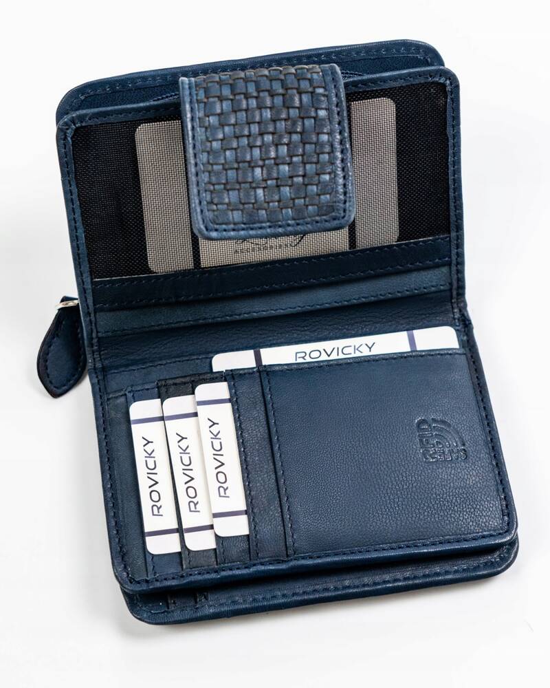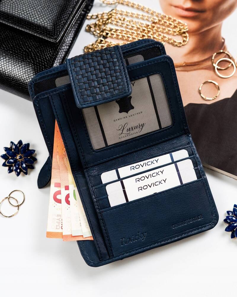 Šis elegantais sieviešu maks no Rovicky ir izgatavots no augstas kvalitātes īstas ādas, kas nodrošina izturību un stilīgu izskatu. Tumši zilā krāsa labi sader ar dažādiem apģērba stiliem. Vidēja izmēra maks ir praktisks un ērts ikdienas lietošanai. Ar integrētu RFID aizsardzību jūsu kartes būs pasargātas no nevēlamas skenēšanas. Makam ir 6-10 karšu nodalījumi, padarot to ideāli piemērotu gan ikdienas lietošanai, gan īpašiem gadījumiem.