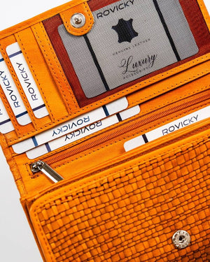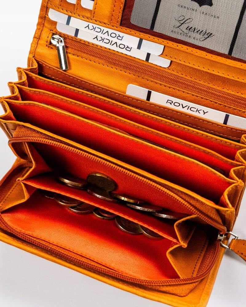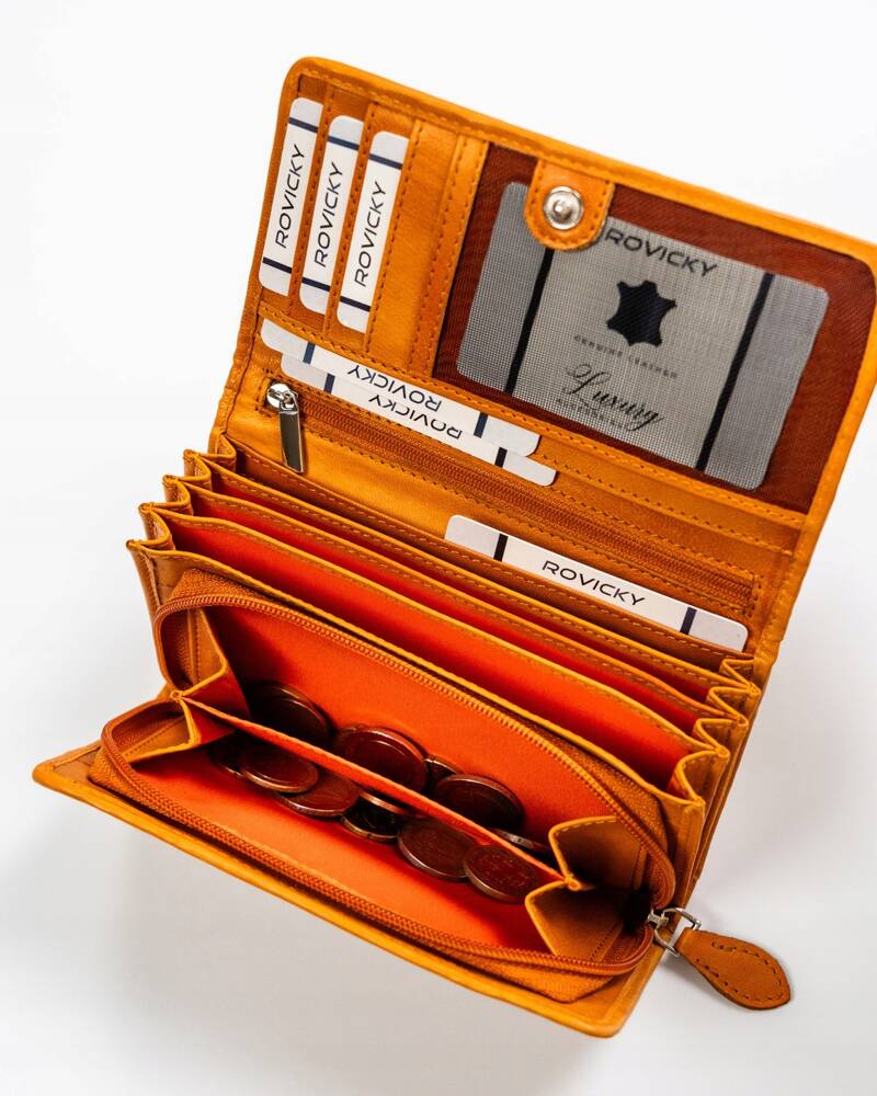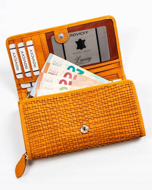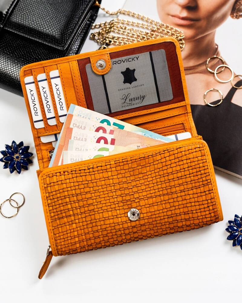 Šis elegantais un praktiskais sieviešu maks no Rovicky ir izgatavots no augstas kvalitātes īstas ādas. Dzeltenais dizains piešķir tam ekskluzivitāti un stilu. Maks ir liela izmēra, padarot to ideāli piemērotu ikdienas lietošanai. Lai gan tam nav RFID aizsardzības, makā ir pietiekami daudz vietas jūsu kartēm, ar 1-5 karšu nodalījumiem. Tā kompaktie izmēri ļauj to viegli ievietot rokassomiņā vai mugursomā.