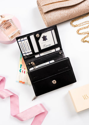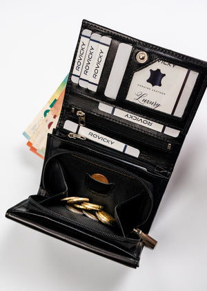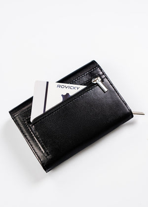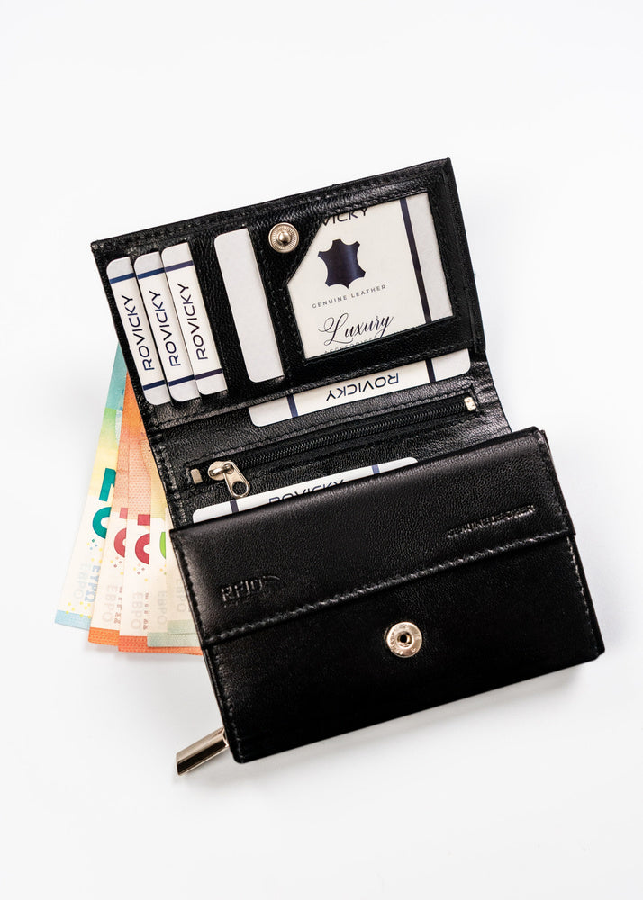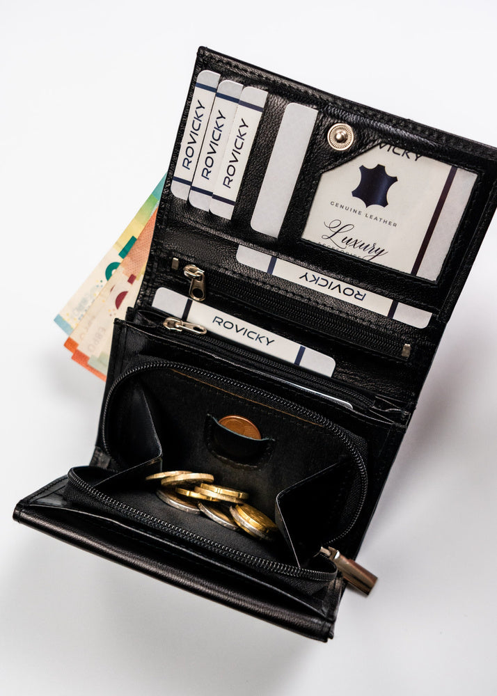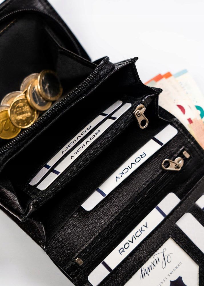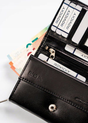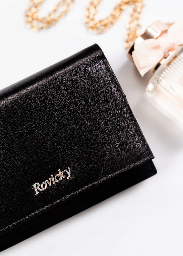 Šis elegantais un funkcionālais sieviešu maks no Rovicky ir izgatavots no augstas kvalitātes īstas ādas. Melnā krāsa nodrošina klasisku un daudzpusīgu stilu, kas piemērots jebkuram gadījumam. Vidēja izmēra maks ir ērts un praktisks, un RFID aizsardzība nodrošina jūsu karšu drošību. Ar 6-10 karšu nodalījumiem šis maks ir lieliski piemērots ikdienas lietošanai.