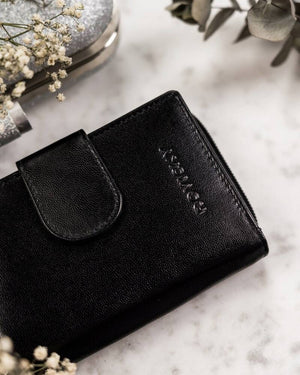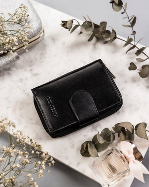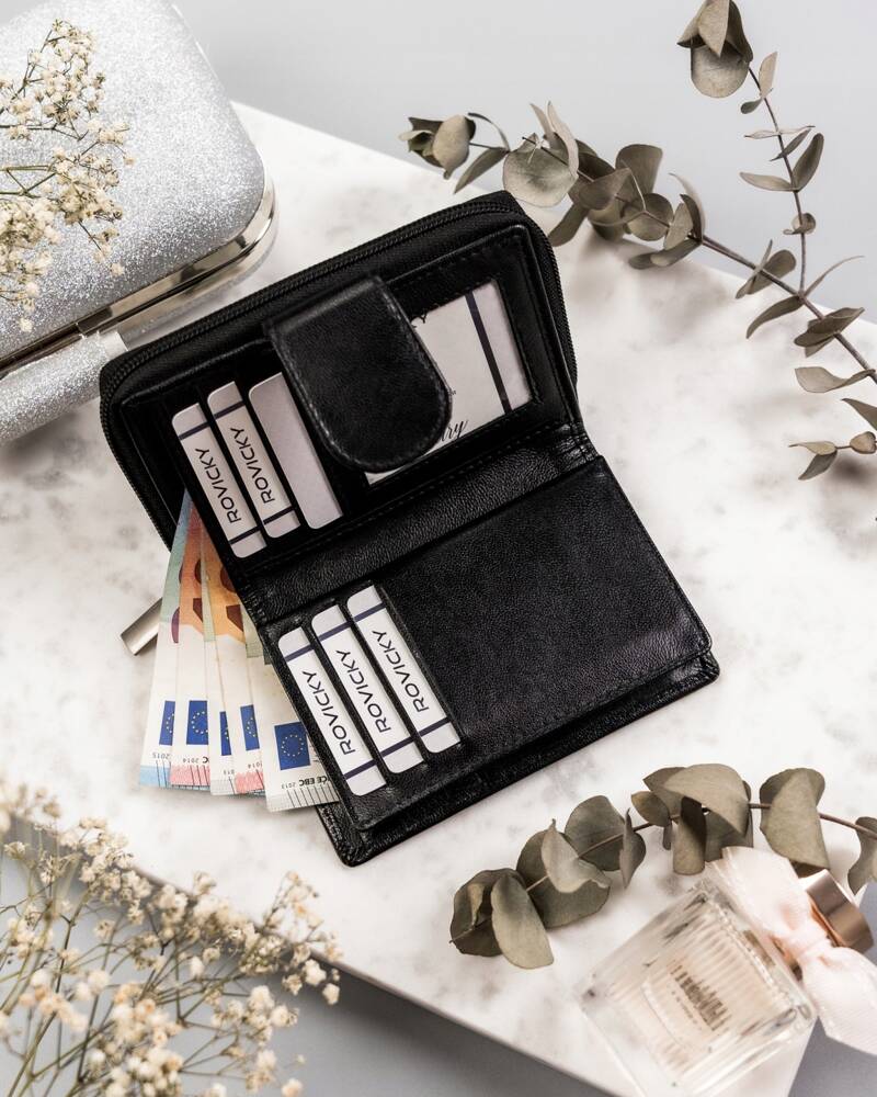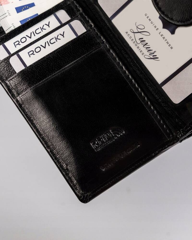 Šis elegantais un kompaktais sieviešu maks no Rovicky ir izgatavots no augstas kvalitātes īstas ādas. Melnā krāsa nodrošina klasisku un daudzpusīgu stilu, kas piemērots jebkuram gadījumam. Maks ir maza izmēra, tāpēc tas ērti iederas rokassomiņā vai kabatā.