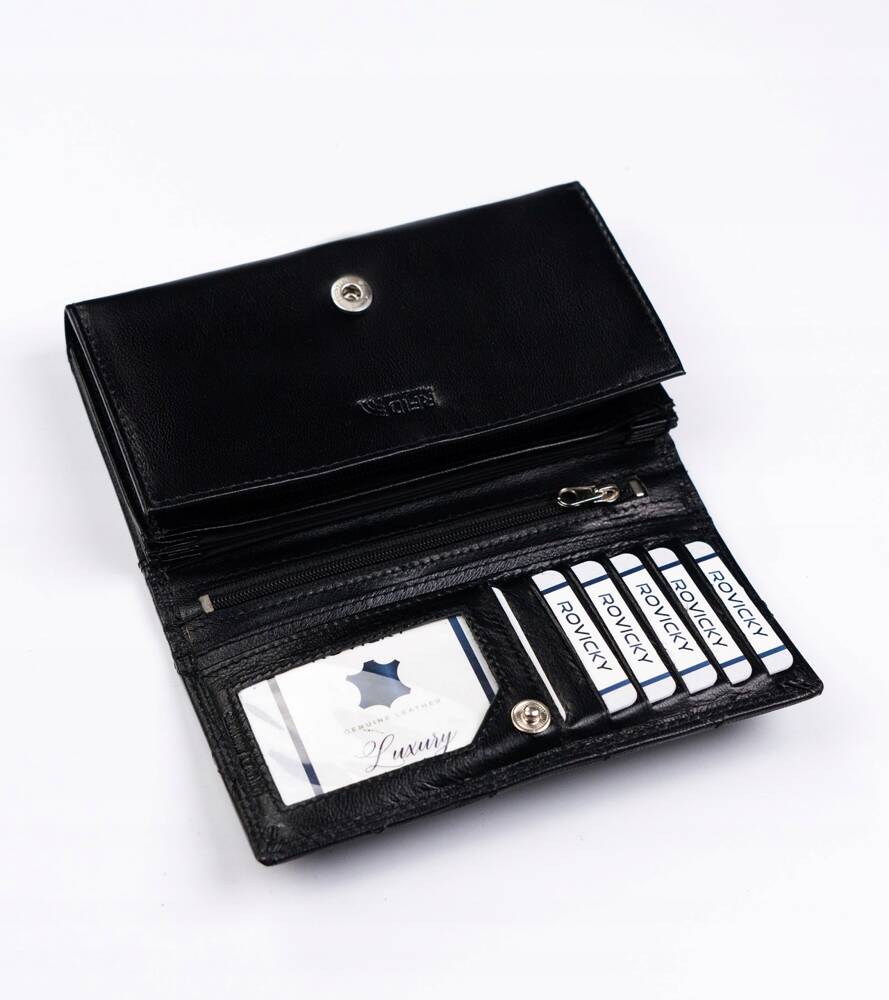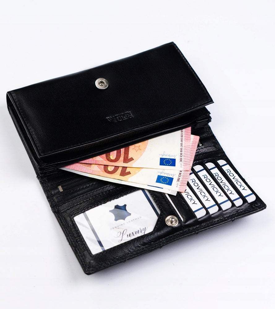 Sieviešu maks Rovicky L167 ir elegants un funkcionāls aksesuārs, kas izgatavots no augstas kvalitātes īstas ādas. Melnā krāsa nodrošina klasisku un daudzpusīgu stilu, kas piemērots dažādiem gadījumiem. Lielais izmērs nodrošina, ka jums būs pietiekami daudz vietas visām jūsu kartēm un skaidrai naudai, un RFID aizsardzība palīdzēs aizsargāt jūsu personas datus no neatļautas skenēšanas. Ar vairāk nekā 10 karšu nodalījumiem šis maks ir lieliska izvēle sievietēm, kuras novērtē praktiskumu un stilu.