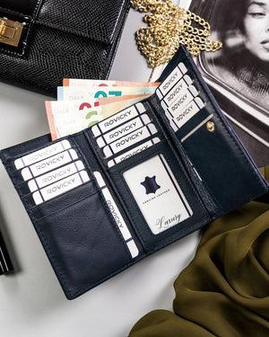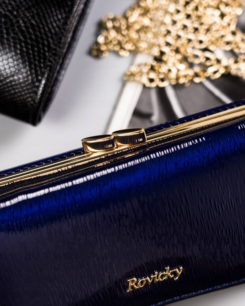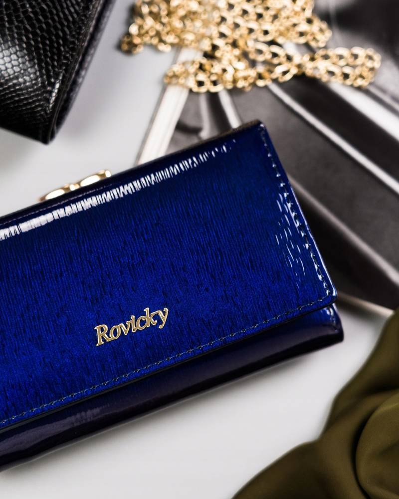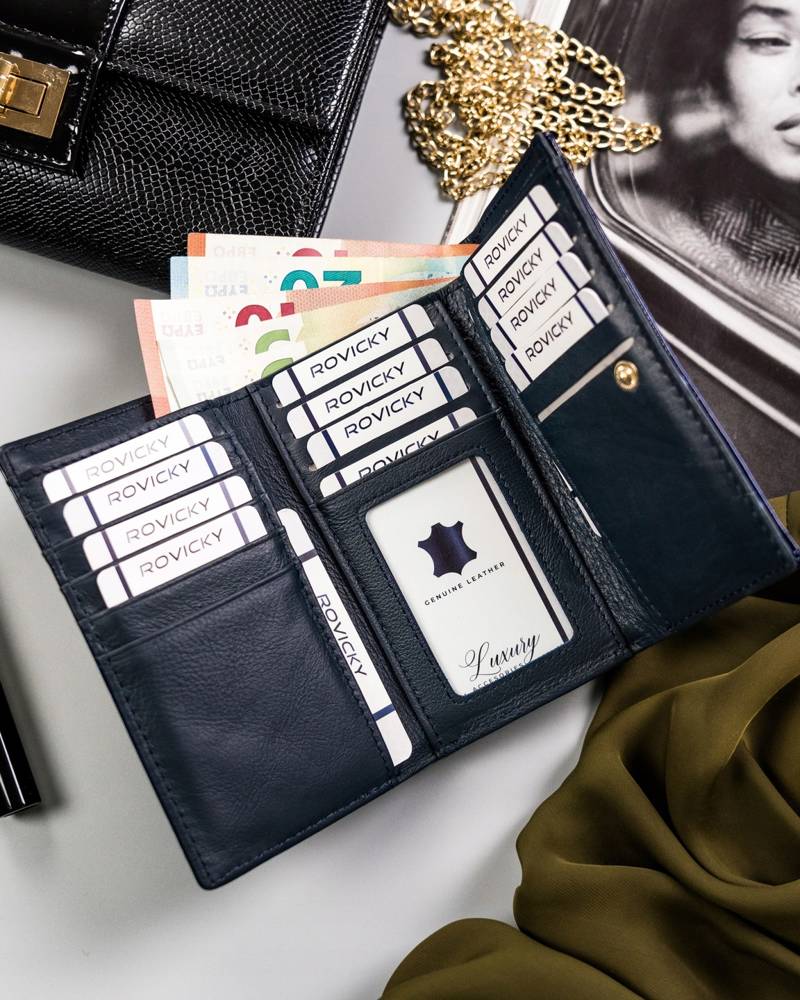 Šis elegantais un funkcionālais sieviešu maks no Rovicky ir izgatavots no augstas kvalitātes īstas ādas. Zilā krāsa piešķir stilu, un vidējais izmērs nodrošina ērtu ikdienas lietošanu. Makam ir vairāk nekā 10 karšu nodalījumi, tāpēc tajā var ērti ievietot visas nepieciešamās kartes. Turklāt integrētā RFID aizsardzība palīdzēs aizsargāt jūsu personas datus no neatļautas skenēšanas.