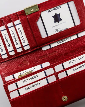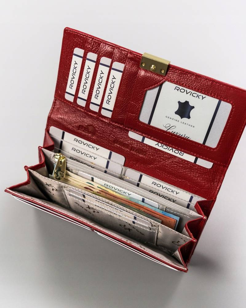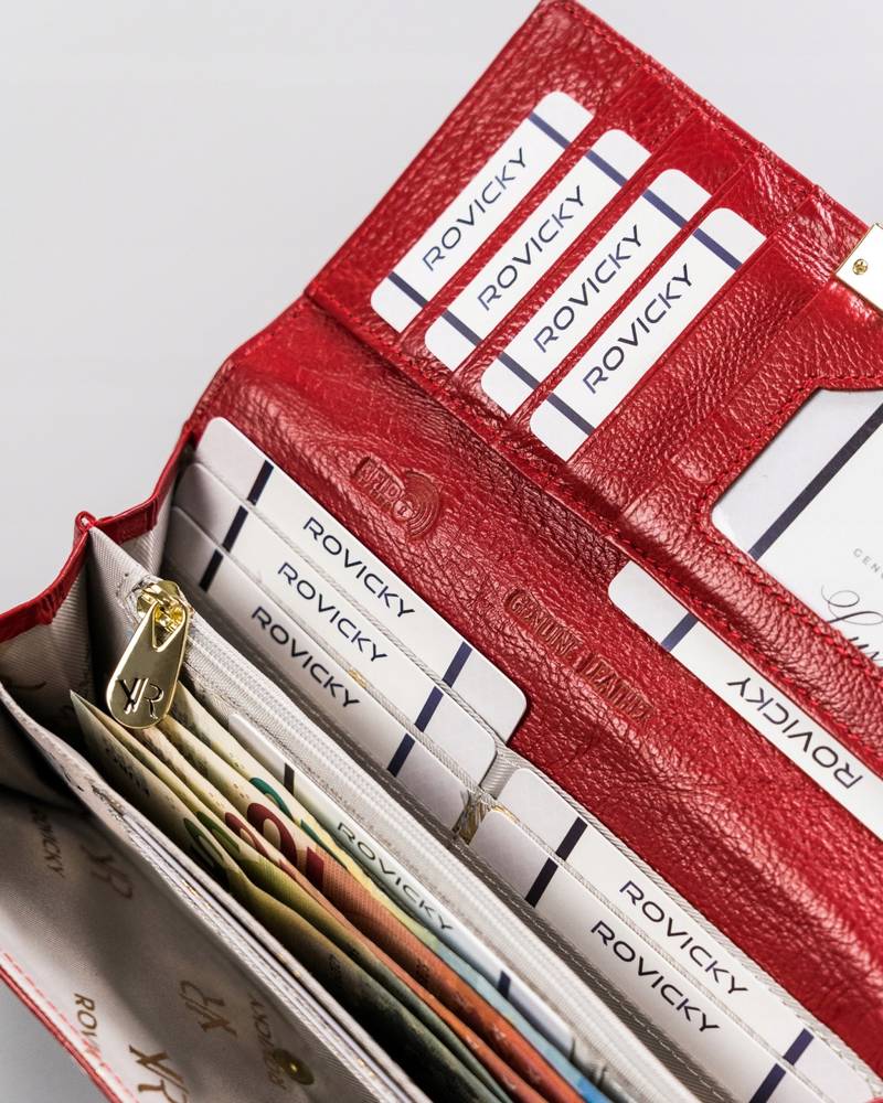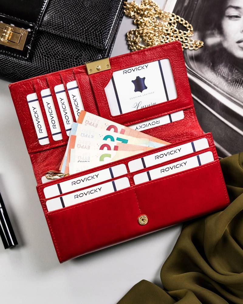 Šis elegantais un funkcionālais sieviešu maks no Rovicky ir izgatavots no augstas kvalitātes īstas ādas. Spilgti sarkanā krāsa piešķir tam izsmalcinātību, un lielais izmērs nodrošina pietiekami daudz vietas visām jūsu mantām. Ar vairāk nekā 15 karšu nodalījumiem un RFID aizsardzību šis maks ir lieliska izvēle gan ikdienas lietošanai, gan īpašiem gadījumiem.