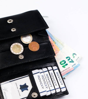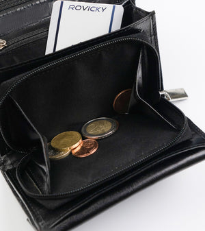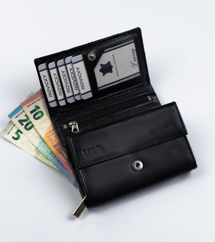 Šis elegantais un funkcionālais sieviešu maks no Rovicky ir izgatavots no augstas kvalitātes īstas ādas. Melnā krāsa nodrošina klasisku un daudzpusīgu stilu, kas piemērots dažādiem gadījumiem. Vidēja izmēra maks ir ērts un praktisks, un RFID aizsardzība nodrošina jūsu karšu drošību. Ar 1-5 karšu nodalījumiem šis maks ir lieliski piemērots ikdienas lietošanai.