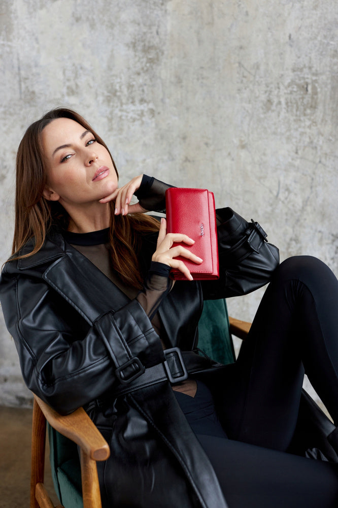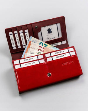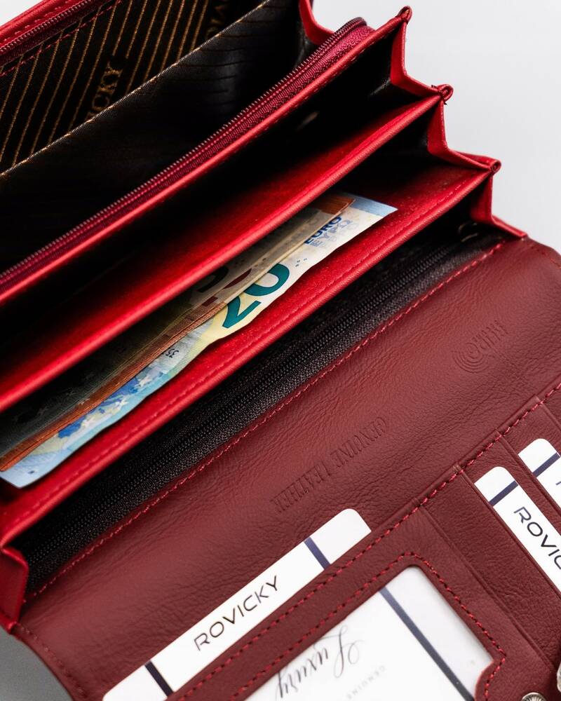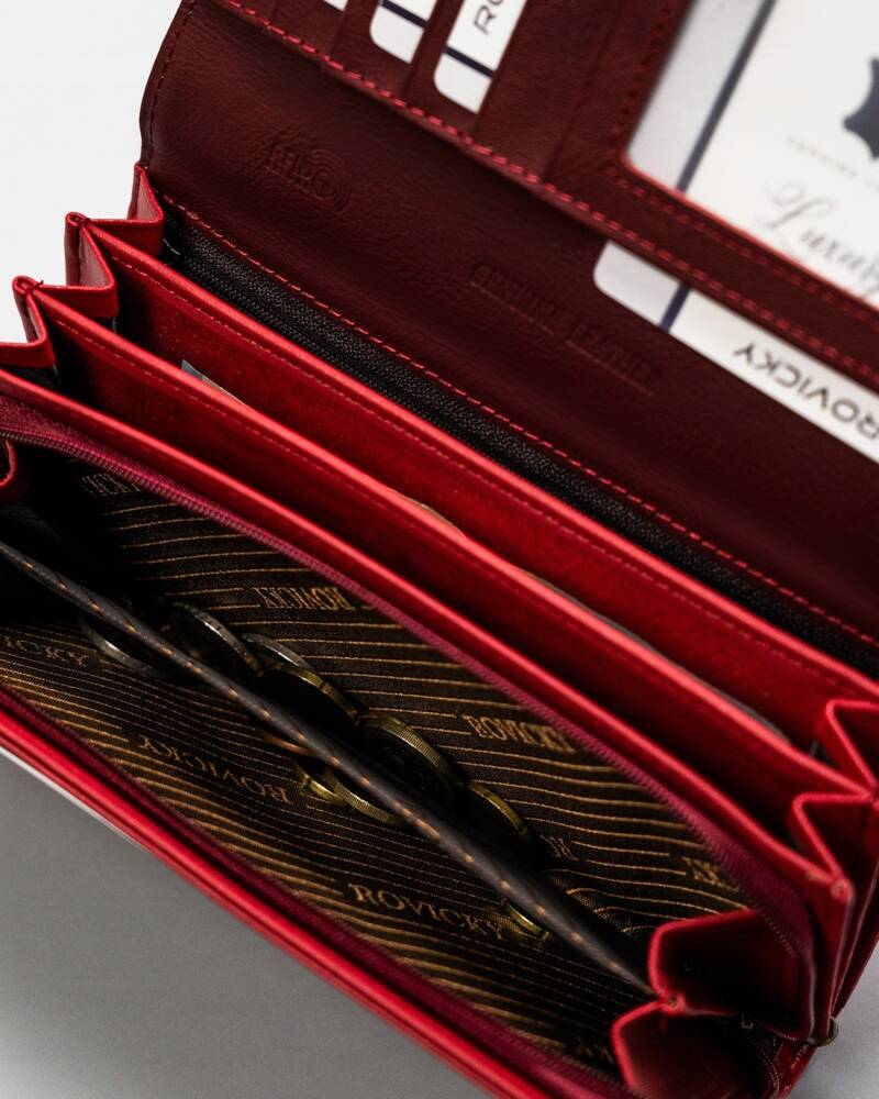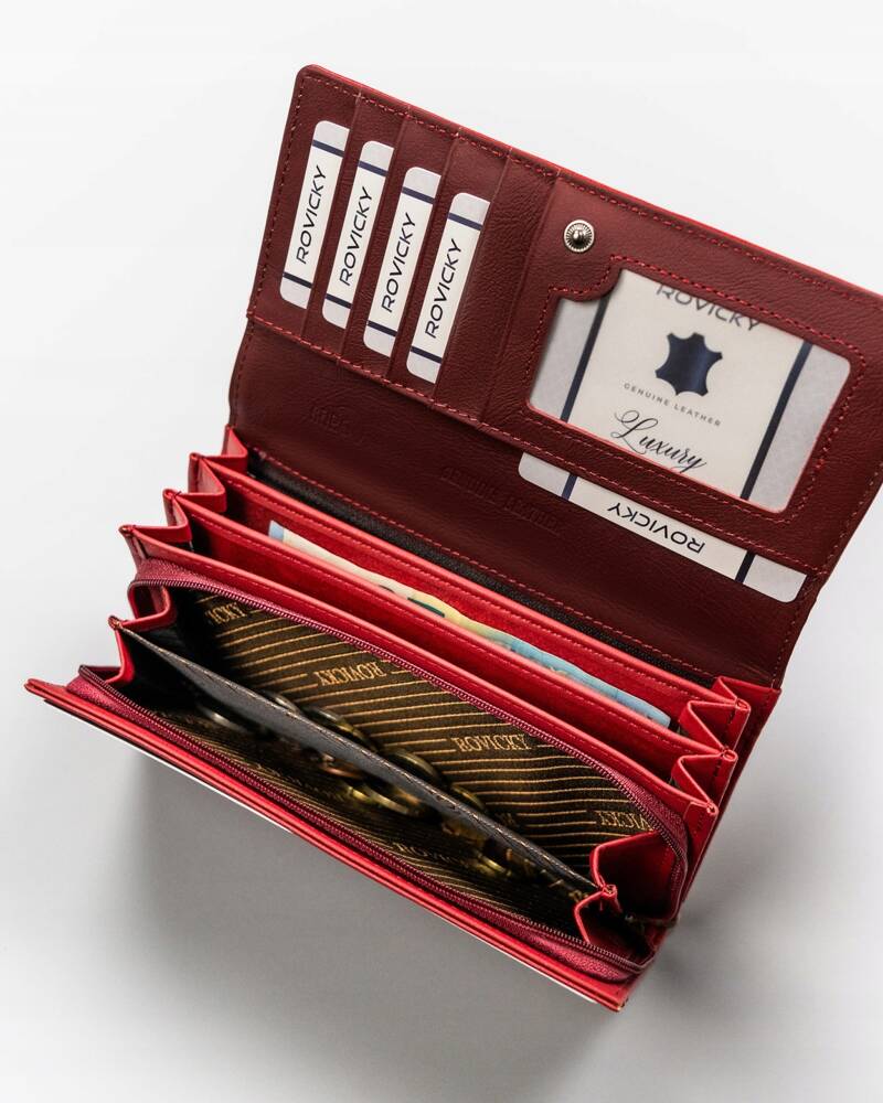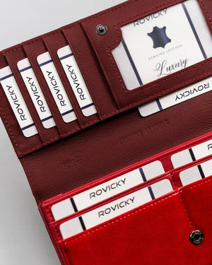 Šis elegantais un funkcionālais sieviešu maks no Rovicky ir izgatavots no augstas kvalitātes īstas ādas. Sarkanā krāsa piešķir tam izteiksmību, un lielais izmērs nodrošina pietiekami daudz vietas visām jūsu mantām. Makam ir arī RFID aizsardzība, kas palīdzēs aizsargāt jūsu kartes no nevēlamas skenēšanas. Ar 6-10 karšu nodalījumiem šis maks ir lieliska izvēle ikdienas lietošanai.