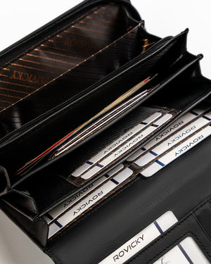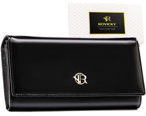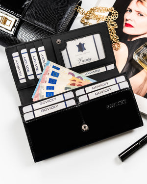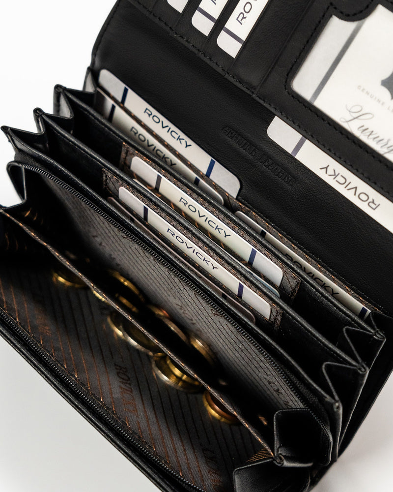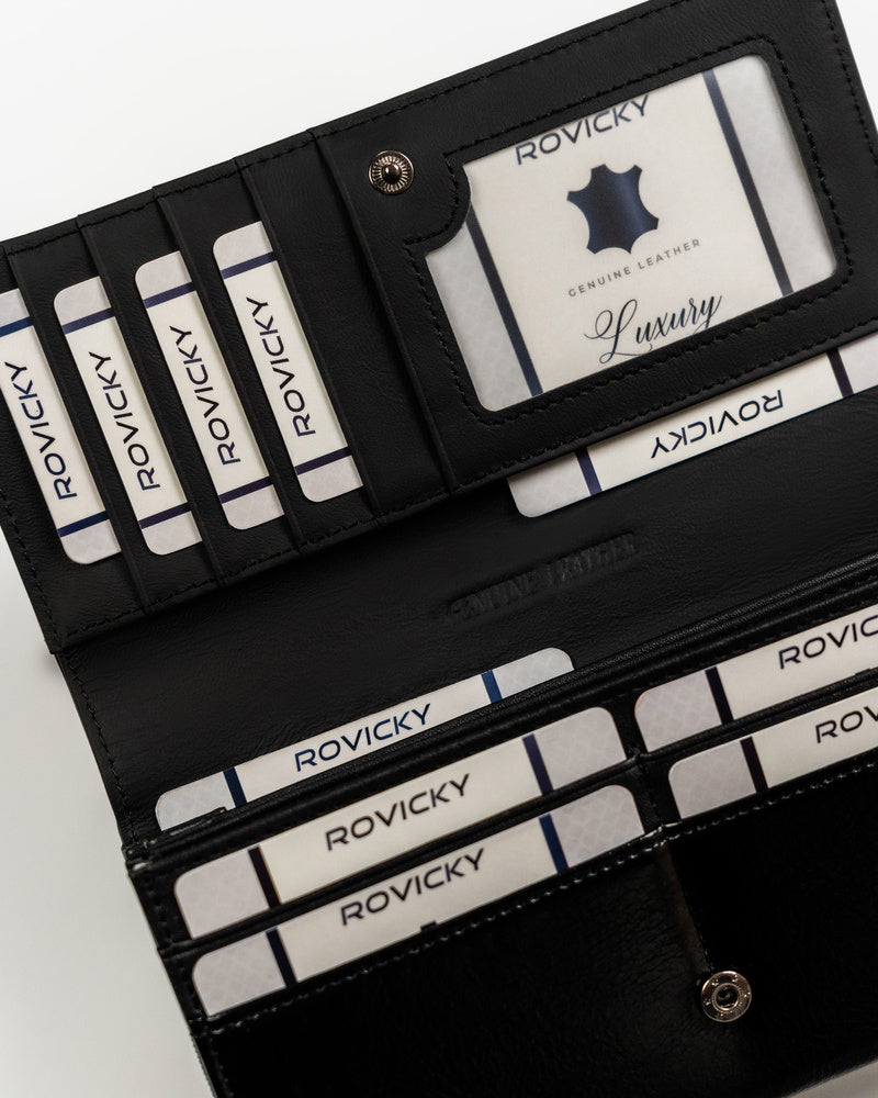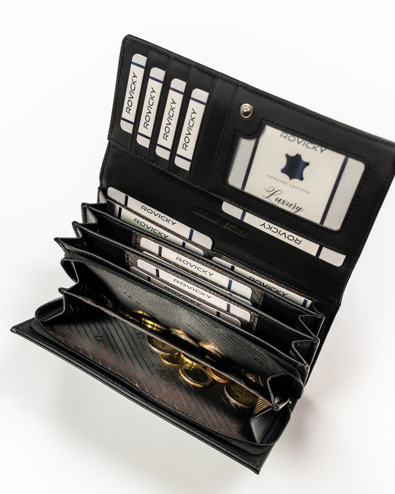 Šis elegantais un funkcionālais Rovicky maks ir lieliska izvēle sievietēm, kuras novērtē kvalitāti un drošību. Izgatavots no īstas ādas, tas ne tikai izskatās grezni, bet arī ir izturīgs. Melnā krāsa nodrošina daudzpusību, tāpēc maks lieliski iederēsies jebkurā stilā. Lielais izmērs un vairāk nekā 15 karšu nodalījumi nodrošina, ka jums vienmēr ir pietiekami daudz vietas visām jūsu nepieciešamajām lietām. Turklāt RFID aizsardzība palīdzēs aizsargāt jūsu kartes no nevēlamas skenēšanas.